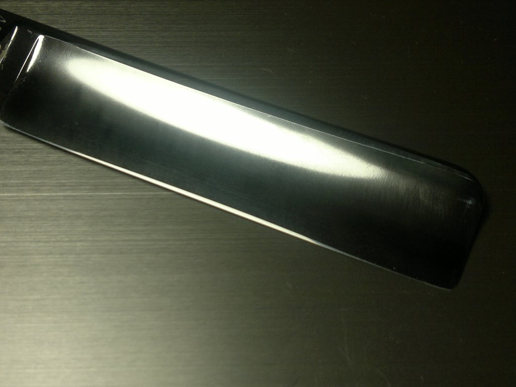 Прокладкой между частями ручки служит свинцовый металл. К сожалению, такие перламутровые ручки довольно хрупки. Большая удача для современного коллекционера – найти образец этой красивейшей ручки без трещин и сколов. Мне повезло найти две такие бритвы, но обе были со сломанными ручками. Было отмечено, что ручки были разных размеров под разную ширину бритв.