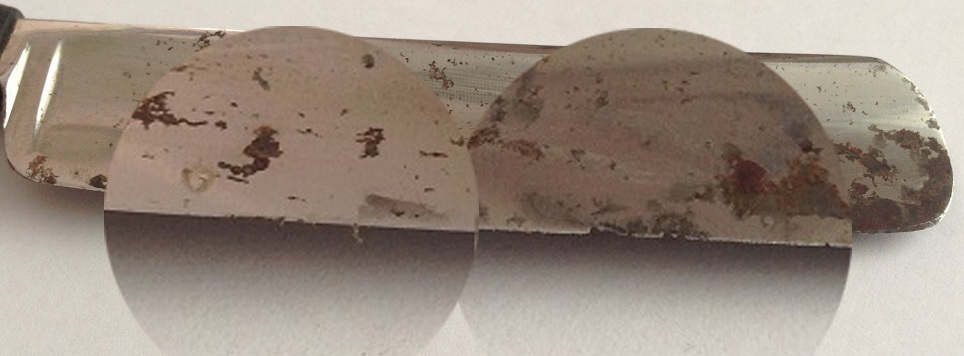 У меня есть простая бритва с надписью solingen бреет идеально толщина метала такая же лежала рядом тоже покрылась ржавчиной но все с нее легко стерлось даже без наждачки обычной полиролью и не было в ней таких каверн.