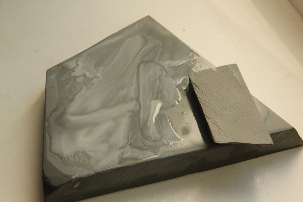 Один из них в коробке и имеет родной слурик. Другой продавался без всяких атрибутов, но по пришествии я сделал вывод, что ничем он не отличается от атрибутированного, кроме как цветом. Кстати обратите внимание, на фото рядом лежит сланец от Петера. По цвету они совершенно идентичны со вторым не атрибутированным эшером. По зрелому размышлению решил старый камень от Петера попилить на слурики и присовокупить один к своему светло-зеленому 7 дюймовому.