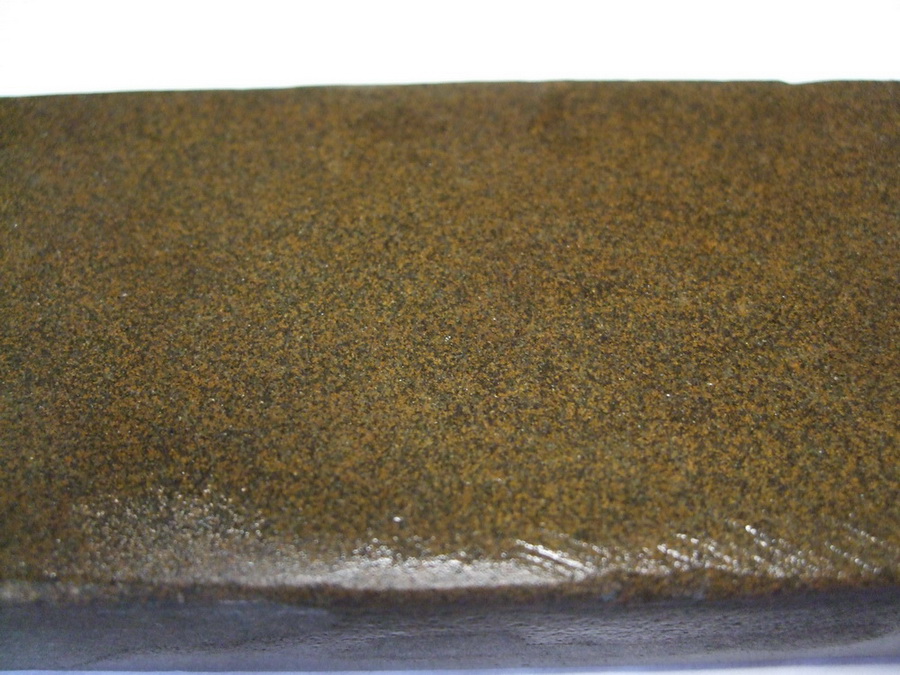 Камень тяжелый и очень твердый. Суспензии почти не дает. Грызет металл отлично. Кромка в зеркало. На ощупь зерно больше F63 однозначно. Размеры 214х48х15мм.Цвет сухого коричнево-серый, мокрого зеленоватый с желтыми крапинками. Под микроскопом поверхность кремнисто-стеклянная, очень плотная. Границы зерен видны только если есть разница по цвету. Основное зерно зеленоватое, вкрапления ораньжево-желтые. 32 года активно мусолю харю клинковой бритвой