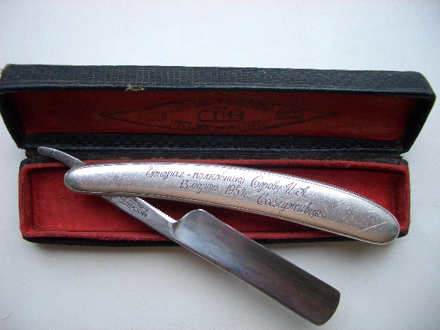 А инэт-то нафиг? Знаменитая бритва! Вот удача, повезло. Читайте: С марта 1954 года - председатель Комитета государственной безопасности (КГБ) при Совете Министров СССР. Вот это высокий ранг! Вот это бритва! Думаю это и есть причина подарка! Ни хрена себе чего ты в растворе замочил! Фигасе самопал! Читайте всё: Серов Иван Александрович - заместитель Народного Комиссара внутренних дел СССР, заместитель командующего войсками 1-го Белорусского фронта по делам гражданской администрации, генерал-полковник. Родился 25 августа 1905 года в селе Офимское Вологодского уезда Вологодской губернии, ныне Сокольского района Вологодской области, в крестьянской семье. Русский. Член ВКП(б)/КПСС с 1925 года. В Красной Армии с 1925 года, став курсантом Ленинградского артиллерийского военного училища. С 1928 года проходил службу в 22-й стрелковой дивизии: командиром взвода, помощником командира батареи, командиром батареи, помощником начальника штаба полка, начальником штаба полка. С 1935 года - слушатель Военной академии имени М.В. Фрунзе, которую окончил в 1939 году. С 9 февраля 1939 года И.А. Серов - заместитель начальника, с 18 февраля 1939 года - начальник Главного управления Рабоче-крестьянской милиции НКВД СССР. С 29 июля 1939 года - заместитель начальника Главного управления государственной безопасности НКВД СССР - начальник секретно-политического отдела. С сентября 1939 года нарком внутренних дел Украинской ССР. В феврале-июле 1941 года - первый заместитель наркома государственной безопасности СССР. В годы Великой Отечественной войны и в послевоенные годы, с июля 1941 года по февраль 1947 года Серов И.А. - заместитель наркома (с марта 1946 года - министра) внутренних дел СССР. Одновременно в апреле - июне 1945 года он заместитель командующего войсками 1-го Белорусского фронта по делам гражданской администрации. За умелое руководство делами, как в наркомате внутренних дел, так и в должности заместителя командующего фронтом и проявленные при этом решительность и мужество Указом Президиума Верховного Совета СССР от 29 мая 1945 года генерал-полковнику Серову Ивану Александровичу присвоено звание Героя Советского Союза с вручением ордена Ленина и медали «Золотая Звезда» (№ 6453). В июне 1945 года - ноябре 1946 года И.А. Серов - заместитель Главноначальствующего советской военной администрации в Германии по делам гражданской администрации. С февраля 1947 года - первый заместитель министра внутренних дел СССР. С марта 1954 года - председатель Комитета государственной безопасности (КГБ) при Совете Министров СССР. Указом Президиума Верховного Совета СССР от 8 августа 1955 года генерал-полковнику Серову И.А. присвоено высшее воинское звание «генерал армии». С декабря 1958 года генерал армии Серов И.А. - начальник Главного разведывательного управления (ГРУ) - заместитель начальника Генерального штаба Вооруженных Сил СССР. Депутат Верховного Совета СССР 1-го, 2-го, 5-го созывов. Член ЦК КПСС в 1956-1961 годах (кандидат в 1941-1956 годах). После разоблачения шпионской деятельности полковника ГРУ Пеньковского О.А., его бывший непосредственный начальник генерал армии Серов И.А. был обвинён в «потере бдительности» во вверенном ему Управлении и Указом Президиума Верховного Совета СССР от 12 марта 1963 года лишён звания Героя Советского Союза и ордена Ленина (Обана! прим Олег Бритва) . Понижен в воинском звании до генерал-майора. 
