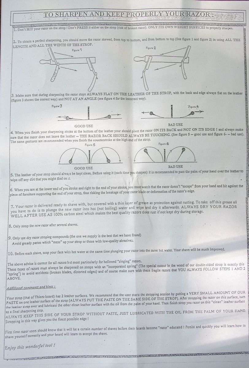 Бритва пришла вместе с инструкциями к применению, и "ready to shave". После нескольких проходов на чистом ремне прошла тест на волос более ли менее сносно, ближе к пятке заметно хуже. Отлично сбривает волос на предплечии, теперь отращиваю щетину, чтобы побрить морду. В общем приобретением пока доволен, надеюсь, что она станет моей основной бритвой. Фотки прилагаются.