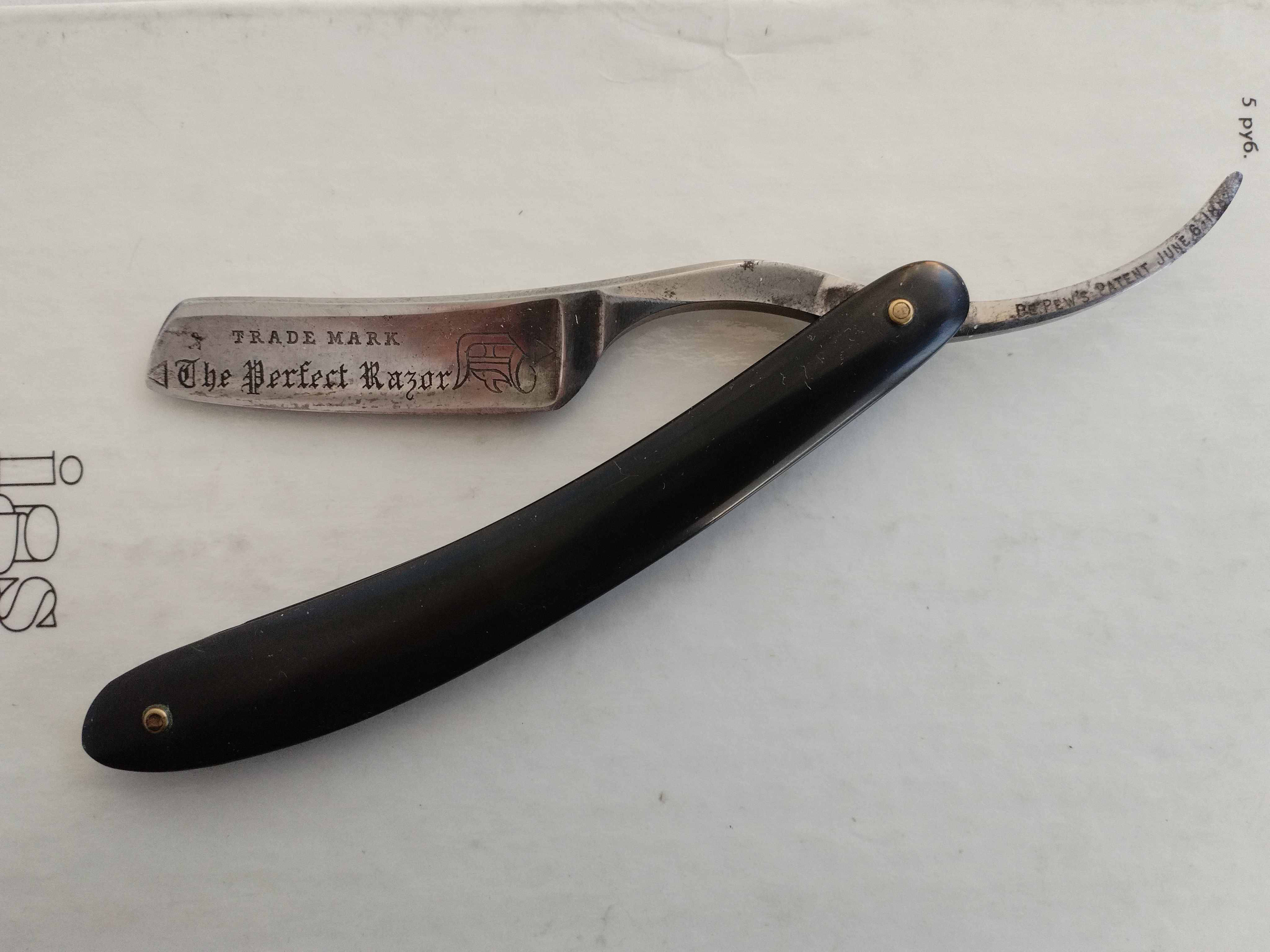 Итак - DE PEW Patent 1882 THE PERFECT RAZOR привлекла меня, прежде всего, формой "Monkey Tail" - обезьянний хвост. Взял. Ручка - рог. Форма и пропорции железа, действительно, изящные, удобный контроль, при ширине 5/8 длина режущей кромки всего 5,6 см. Да, внешне (на глаз, именно - пропорциями) и тактильно (по физике) производит очень приятное впечатление. Чуть почистил, поточил, побрился. Сразу оговорюсь: не стал насиловать, дабы не испортить. При минимуме усилий - результат на 4,8 по 5,5 балльной шкале