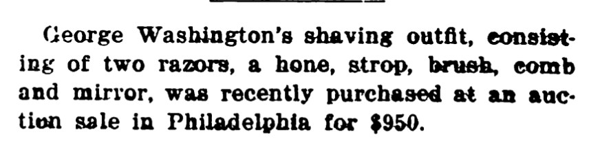 Все говорят, но немногие знают, в каком. Re: Легендарные бритвыБритвенный набор Джорджа Вашингтона, состоящий из двух бритв, точильного камня, ремня для правки бритв, щетки, расчески и зеркала, был недавно куплен на аукционе в Филадельфии за 950$