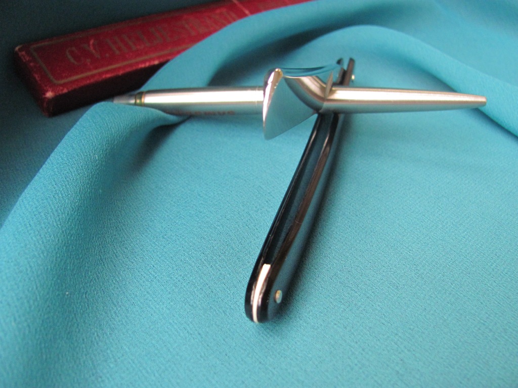 Производитель: J.A.Henckels. Twin Works. Solingen. Germany. Model 415 Размер: 5/8 ( а точнее ширина 16.5 мм.) Состояние: минимальное б.у., сохранность очень приятная, заточена и готова к бритью. Ручка из пластика, перламутровая, с медными наконечниками, одним словом -красивая. Цена: проданы близнецы Henckels Show