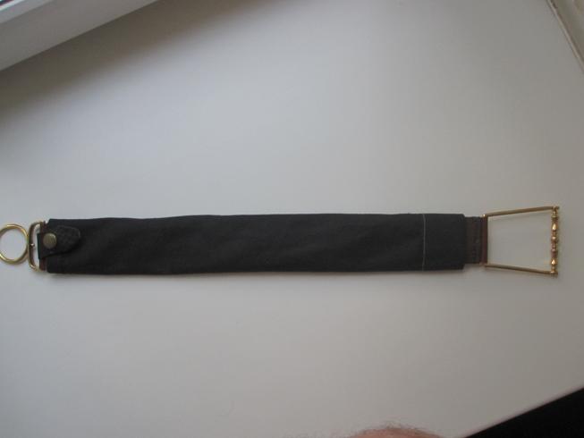 Re: Изготовление ремней для правкиИзделал такой вот ремень,кожа немецкого солдатского ремня,вымачивал,вытягивал и т.д.Подвес и ручка мне нравятся такие, какие и поставил,ну и к каждому своему ремню я шью брезентовый чехол,не знаю зачем