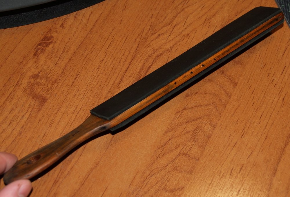 Деревяшка от старого ремня, который шел довеском к таким же старым бритвам. Кожа мумифицировалась и была безжалостно оторвана. Деревяшка была крашена, судя по всему, черной морилкой и лаком, от которых тоже осталось немного. Деревяшку вышкурил, покрыл составом а-ля даниш ойл. Кожа - шора хим дубления. Жировал, вышкуривал. Одну сторону пытался заглянцевать методом Франса. Разницы не увидел, наверно кожа не труъ. Правит ремень конечно похуже франсовского. Но на две недели - лучше чем ничего. Ремень маленький, 25 см в длину весь Муссолини харь псевдозаточкой. Типазаточник-параллельщик. Баблосгрёб.