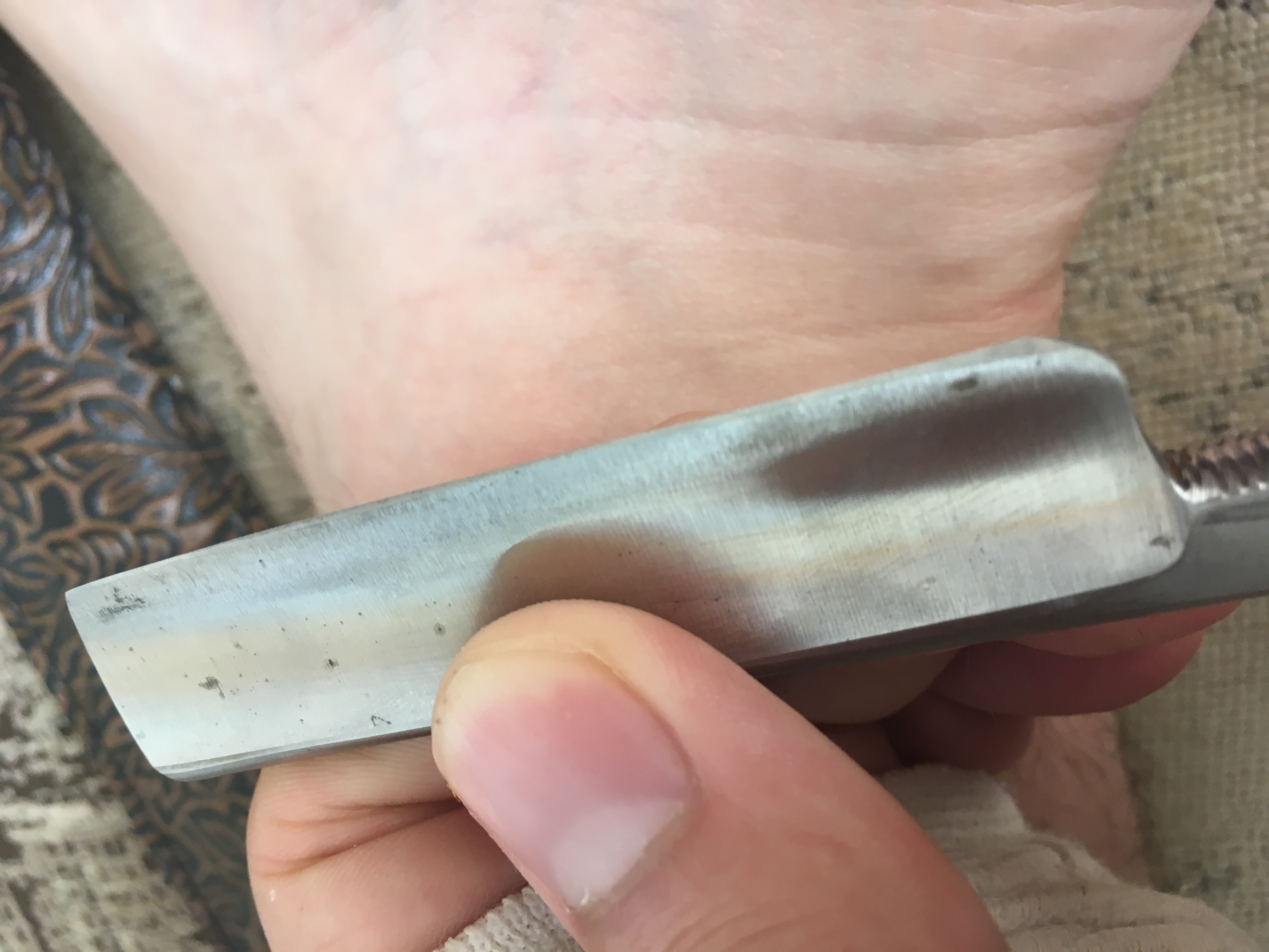 Хочется начать со слов на фотках все прекрасно (или ужасно) сразу особенно забинтованная надеюсь не порезанная тупой бритвой Но с чего начать... с того что надо много читать Судя по фото вы точили насухую? Но камни таки ВОДНЫЕ. Их надо замочить до тех пока не перестанут выделять воздух. Во вторых камни надо регулярно (относительно) править оно же и будит чистить их. На грубую правят насыпав абразивный порошок на ровную поверхность и трут водный камень с водой на абразиве (уточняю что водный - один раз человек решил править насухую а это крайне вредно для здоровья) Но эти камни относительно мягкие и они легко правятся сами на себя - на куске толстого стекла сами выделяют суспензию и ровняются и очищаются (все с водой и замоченное) так как камни китайские то зерн отам кетайское На бритву при заточке не давить. Чист теоритически чтобы бриться с этим набором... Надо научится ровнять и чистить камни. научится точить и добавить ремень с пастой полировальной (типа ГОИ) и после чистого ремня можно будет побриться но морда лица все таки будет немного гореть