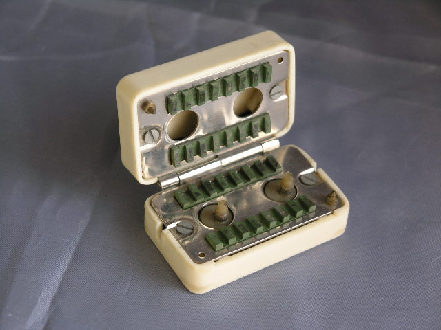 Т.е. естественно никто не менял лезвие каждый раз. Правда существовали маленькие станочки для заточки этих одноразовых бритв, но наверное большого распространения не получили, так как малоизвестны, да и в сети, включая зарубежную я встречал упоминание о них (с фото на ebay.com и molotok.ru) несколько раз. Опять же невостребованность связана наверное именно с той самой смазкой, которая делаеть бритье комфортным, которую повторно не нанесешь. А мыльный налет очевидно удаляется во время смены лезвия, как плановая операция по уходу за станком. Картинку одного из приспособлений прикрепил. Взял с молотка.