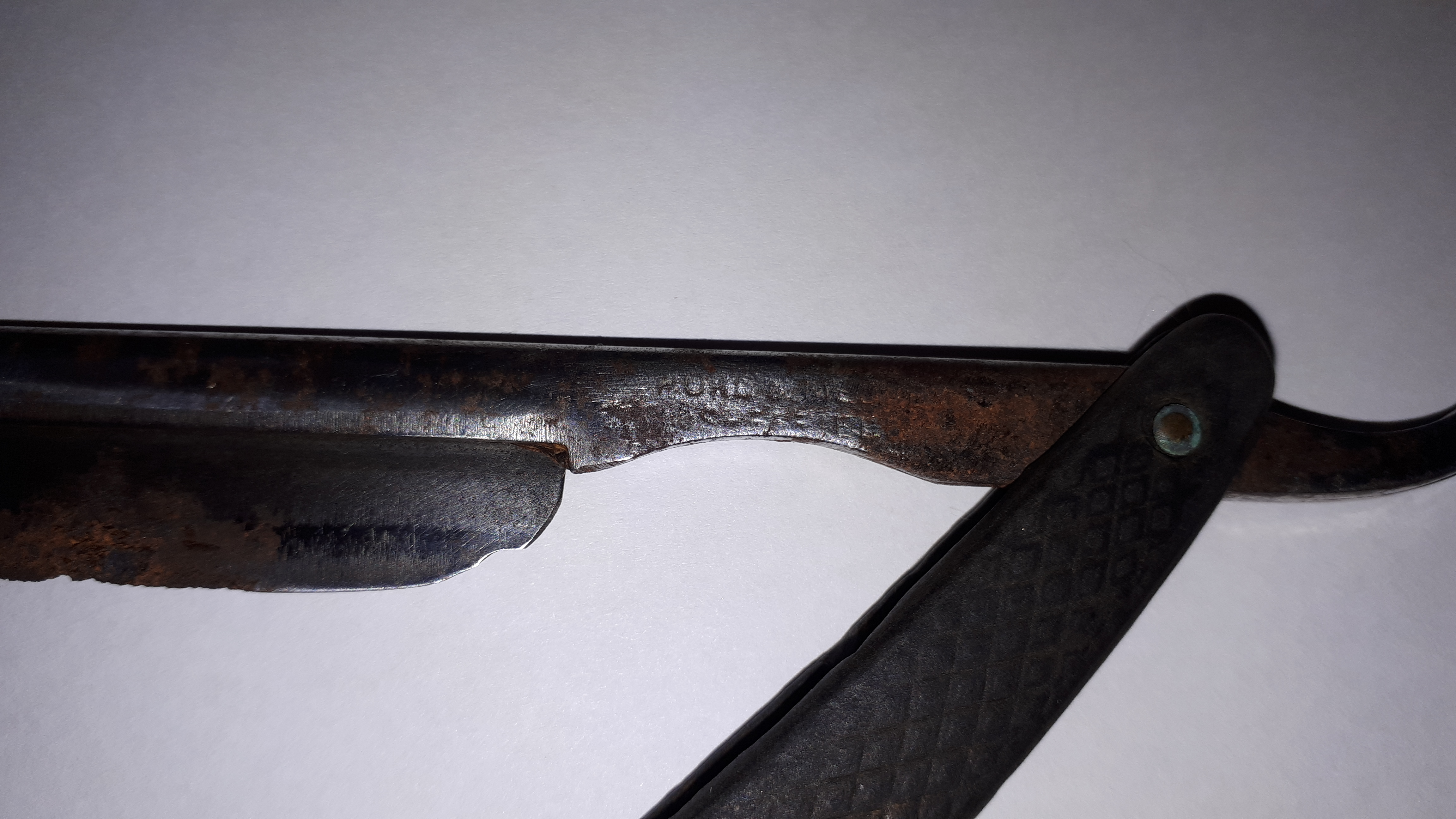 Оцените пожалуйста Ford&MedleyСильная коррозия от кромки на полотне свела цену этой бритвы почти к нулю (т.к. сколько не затачивай, а в этом месте будет ржавая слабая кромка). Ручка кстати, похожа на советские из конца 40х, но если сравнивать, то все таки немного отличается насечка на ней, так что может и родная