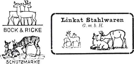Однако, Linkat Stahlwaren GmbH, Solingen, Birkerstrasse 32 in 1922. Brand names: 'Bock & Rieke', 'Linkat'