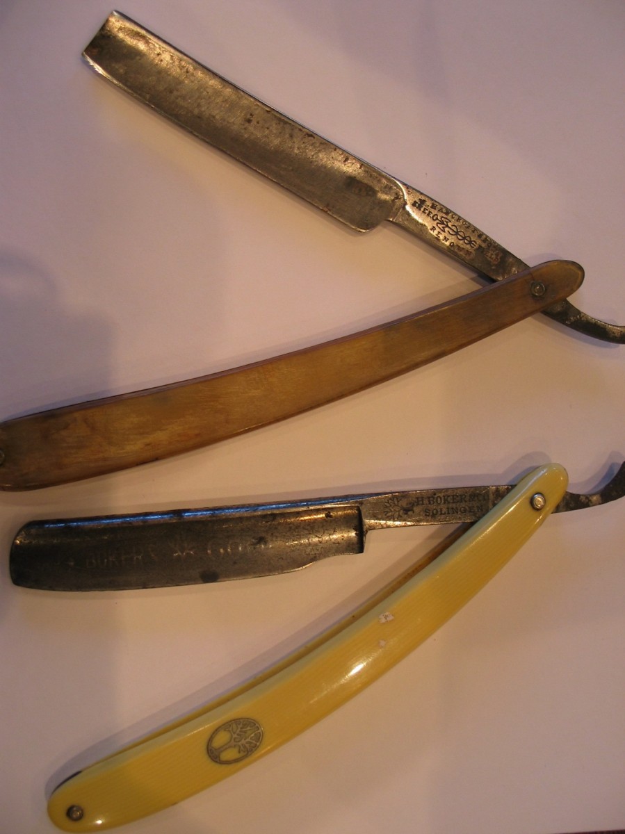 На первой нерасколется а уже фактически расколась ручка вокруг заклепки. Оба полотна после восстановления будут очень тонкими и малопригодными для бритья - т.е. они не буду иметь стоимости ни как антиквариат, ни как бритвы. Но если дороги как память то визуально можно восстановить.