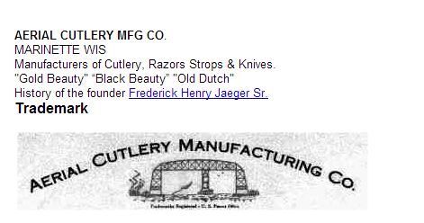 Re: AERIAL Cutlery Manufacturing CO., Marinette, Wisconsin,Первый серьезный вызов для фирм в Огайо был получен от братьев Jaeger из Duluth, Minnesota. В 1909 году они основали Aerial Cutlery Co., чьим основным товаром были ножи с картинками на ручках. В 1912 году они перенесли производство в Marinette, Wisconsin.