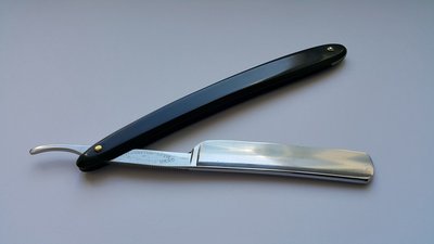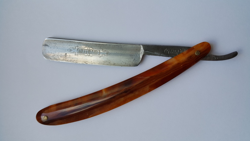 Бритва полностью в рабочем состоянии. Ручка целая, ровная, клинок паркуется по центру, без закусываний. На осевом пине сидит достаточно плотно, под собственным весом не вываливается. Парковка сделана утыканием носика бритвы в клинышек ручки. Насечка с двух сторон эрля. Длина рабочей кромки 8 см. Длина ручки 15 см, длина клинка 14,5. Обух 5+ мм. Увесистая бритва, 54 грамма.