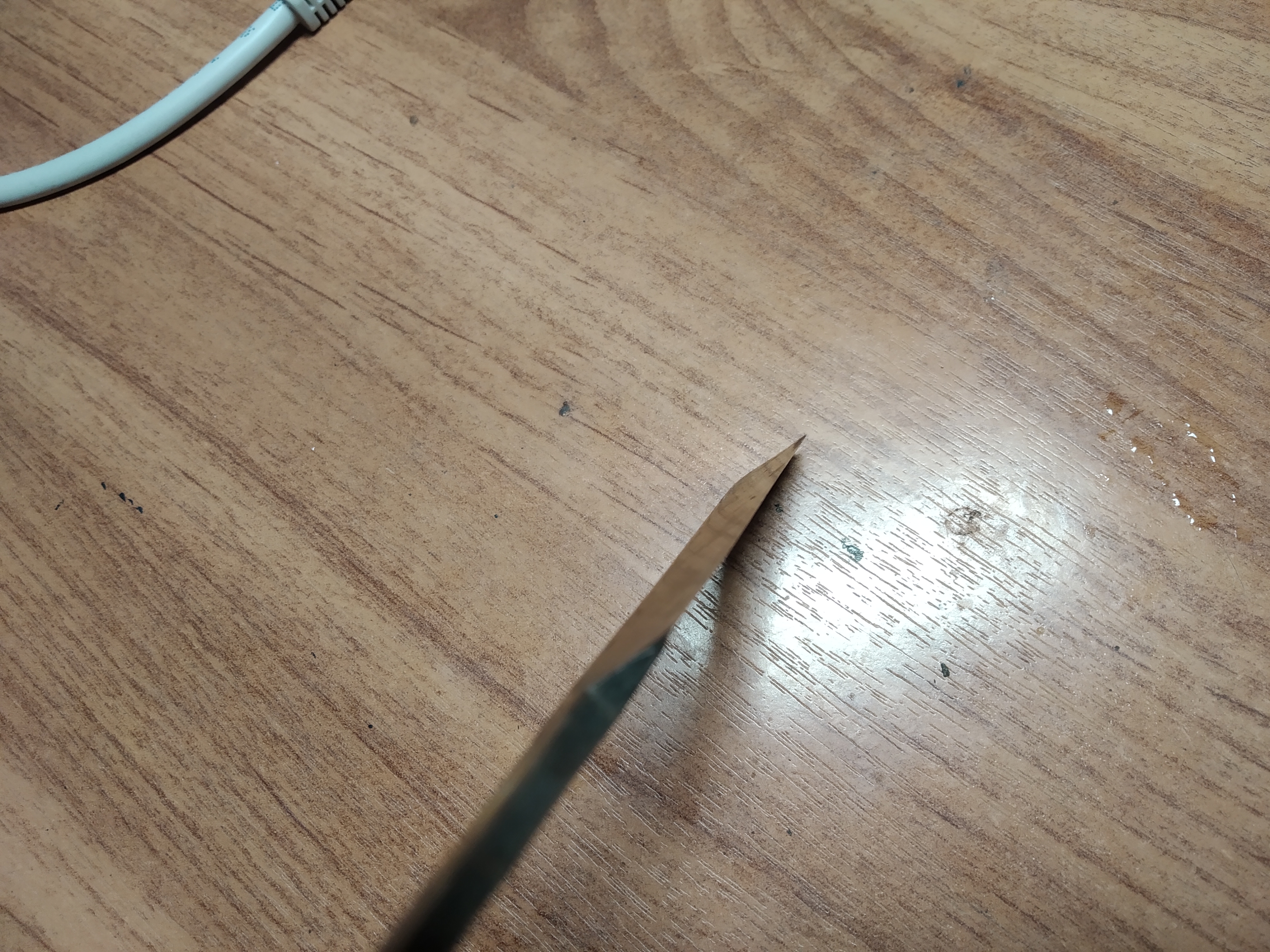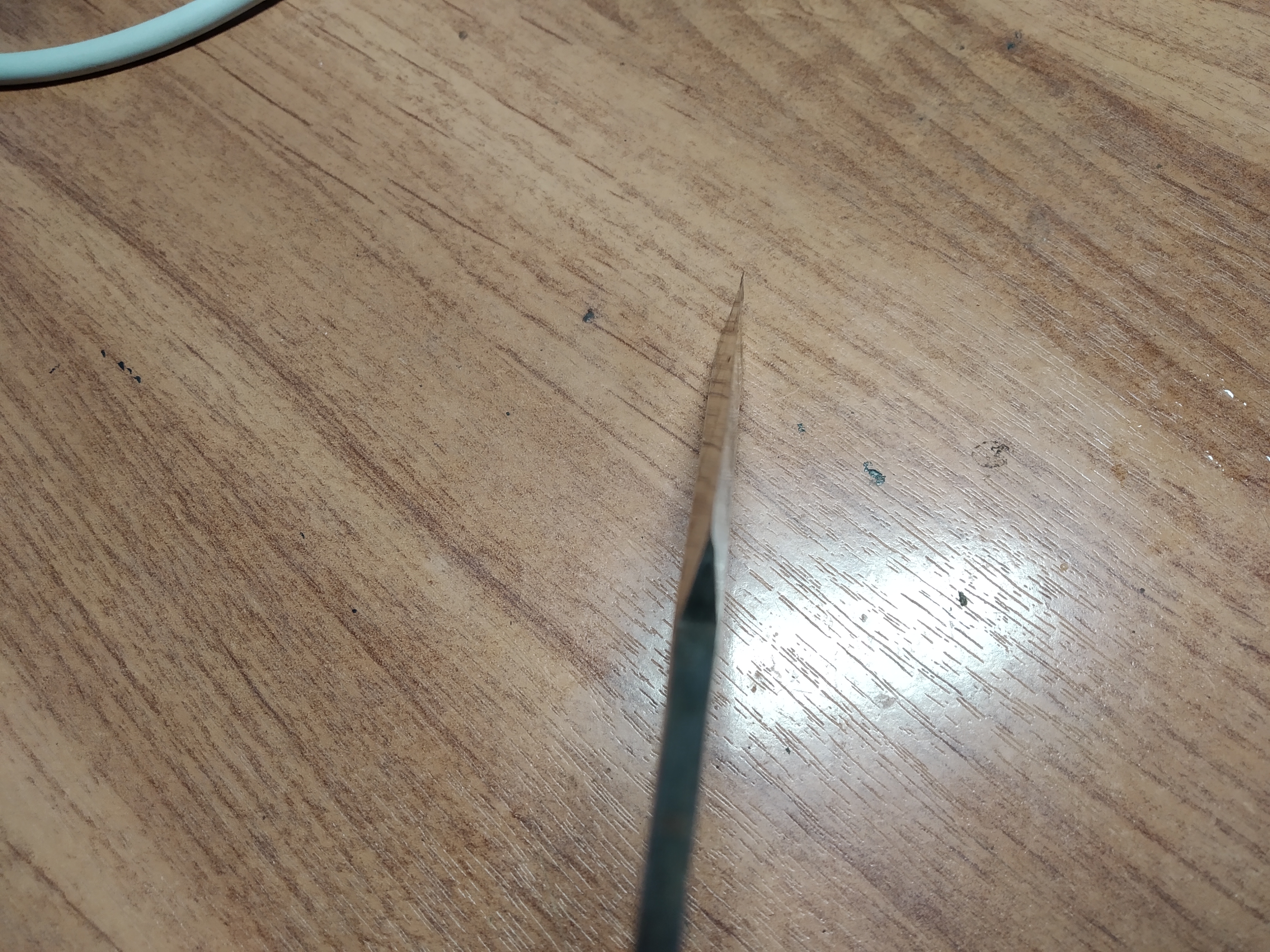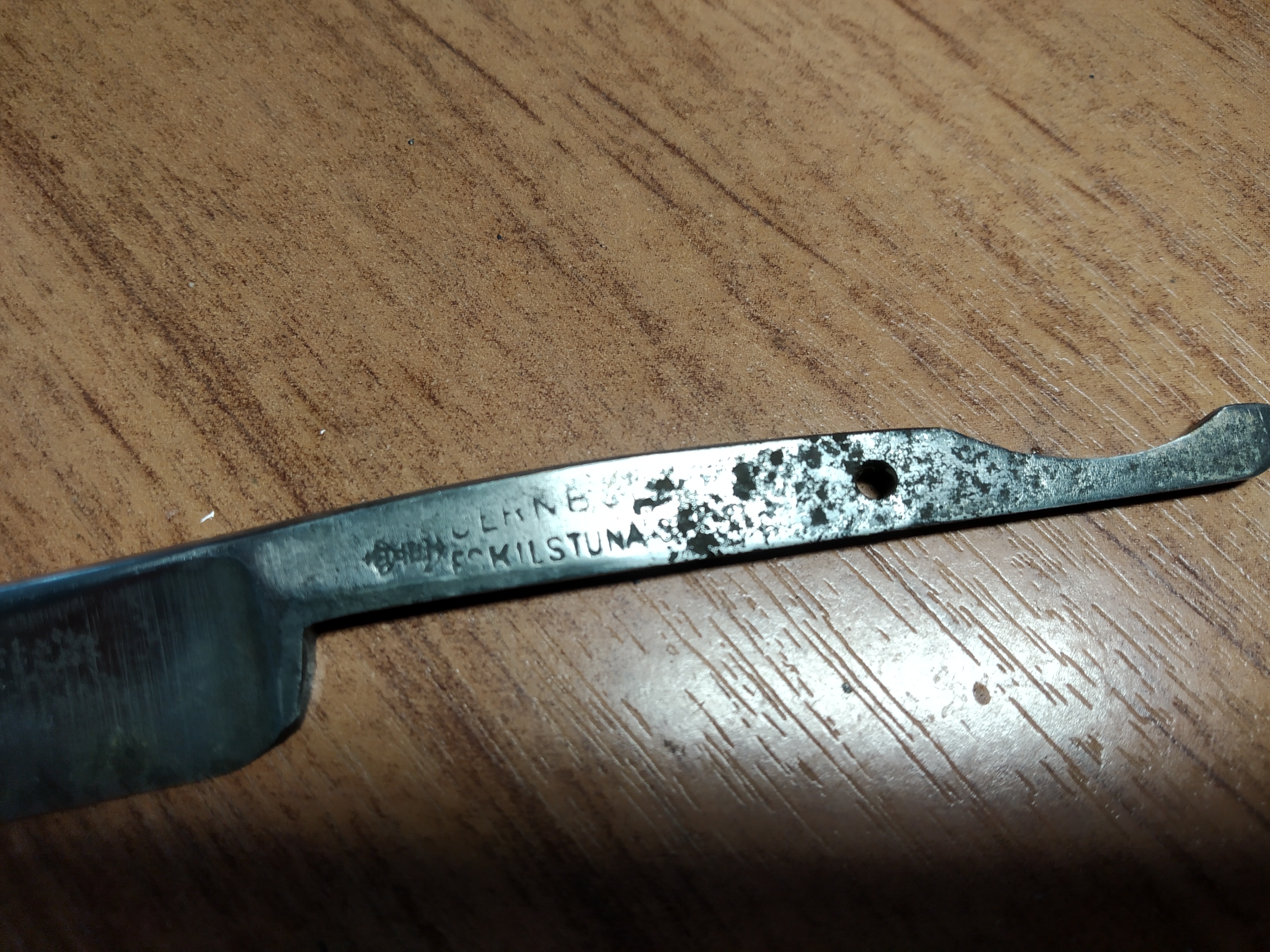 Старая EskilstunaЭто Jernbolaget. В принципе восстановимый клинок, но не лучший для первого опыта. Обух неравномерно сточен и обратная улыбка немного. Но изолента и терпение могут помочь. При помощи изоленты сваять равномерный обух и долго и нудно елозить по тысячному камню, пока не сведётся новая кромка.