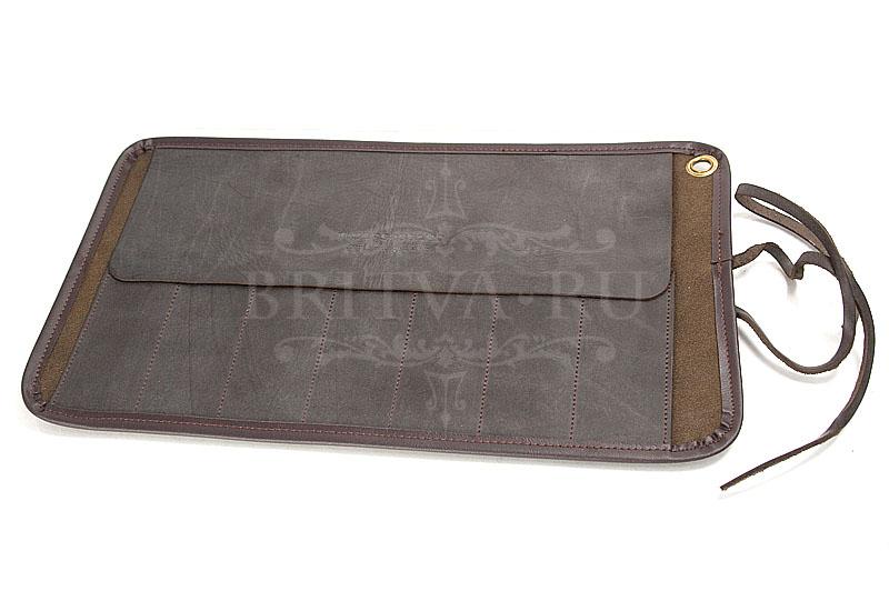 Пенал сделан из натуральной кожи. Сворачивается в рулон, завязывается собственными кожаными шнурками. Имеет встроенное кольцо-крепление.