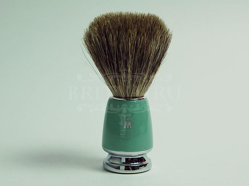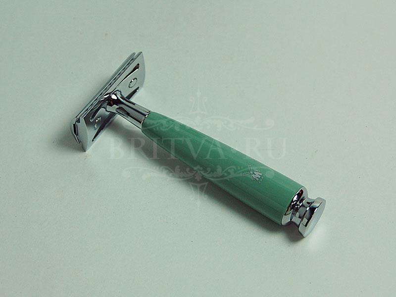 Высококачественный элитный бритвенный набор из серии RYTMO. В комплекте Т-образный станок для бритья "прямой срез" с ручкой из синтетической смолы, кисточка-помазок для бритья из натуральной щетины барсука с ручкой из синтетической смолы и удобная хромированная металлическая подставка. Цвет смолы - мятный.