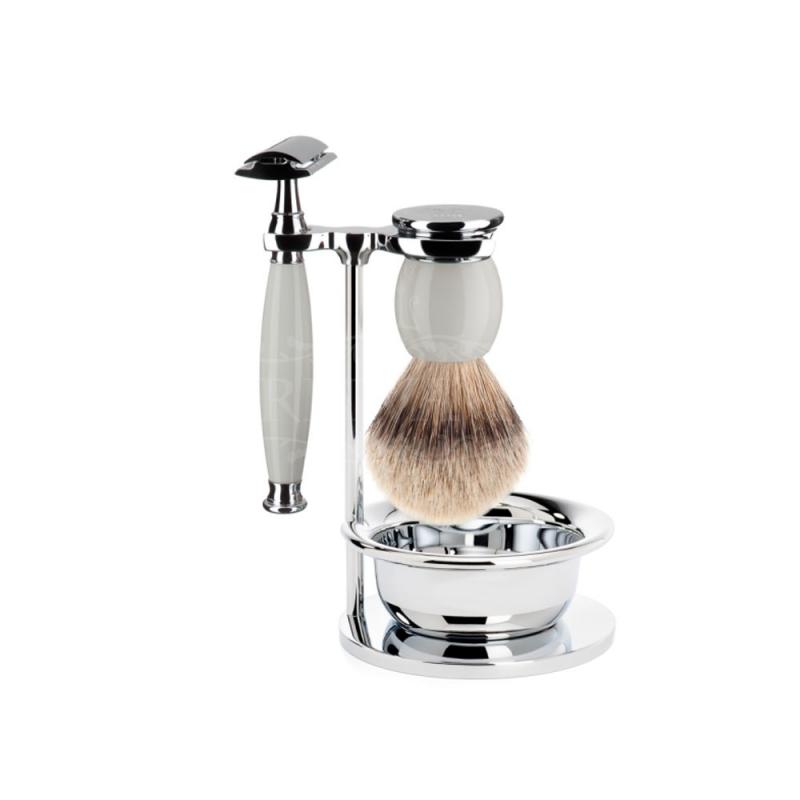 Высококачественный элитный бритвенный набор серии Sophist. В комплекте Т-образный станок для бритья "прямой срез". В комплекте станок для бритья с ручкой из фарфора, кисточка-помазок для бритья из высококачественной щипаной щетины барсука с ручкой из фарфора, металлическая чашечка и удобная металлическая подставка. В комплекте одно лезвие.
