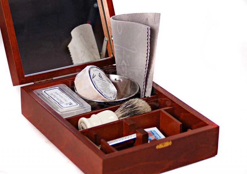 Элитный набор для бритья в деревянной шкатулке ручной работы, разработанной и произведённой фабрикой Thiers-Issard. Набор представляет собой воспроизведённую копию набора для любителя бритья Т-образным станком начала 20 века. Обладание таким набором в то время было показателем высочайшего статуса мужчины в обществе, он использовался как дома, так и в путешествиях. Настоящий набор джентльмена! В набор входят все необходимые для бритья и ухода за бритвой аксессуары: кисточка-помазок высокого качества с белой пластиковой ручкой, металлическая чашечка для взбивания пены, мыло для бритья (84г. брутто), алюмокалиевые квасцы для остановки крови (125г.) в пластиковом футляре, станoк для бритья Т-образный с головкой "прямой срез" и шестигранной резной ручкой и 1 упаковка лезвий Personna Platinum (10 шт.). Предусмотрено 2 отделения для Т-образных бритв, дополнительно можно поместить несколько упаковок лезвий. Отдельного внимания заслуживает шкатулка. Изготовленная вручную из твердых пород дерева, она отлично подходит для хранения и транспортировки опасных бритв и аксессуаров для бритья. В крышку шкатулки встроено полноразмерное зеркало. При желании Т-образную бритву можно заменить на обычный станок.