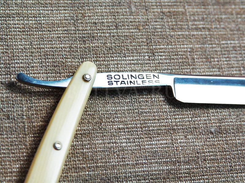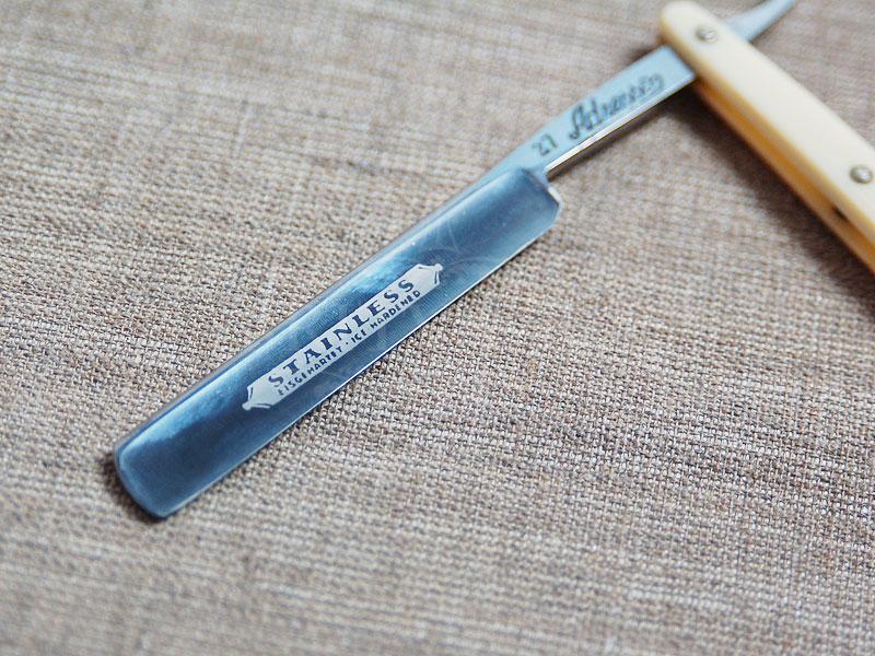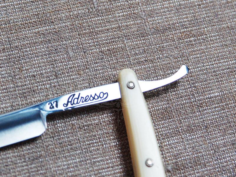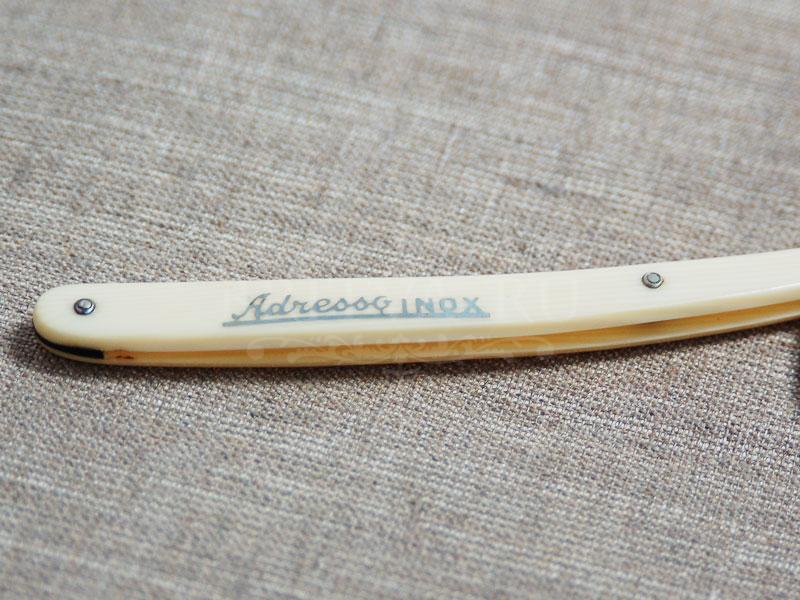 Ширина полотна 3/8", французская головка, вогнутость 1/2, нержавеющая сталь, ручка из жёлтой пластмассы имитация слоновой кости. Полотно украшено травлением STAINLESS EISGEHARTET ICE HARDENED. На лицевой стороне эрля штамповка 21 и логотип Adresso, на обратной SOLINGEN STAINLESS. На ручке металлическая впайка в виде лого Addresso INOX.
