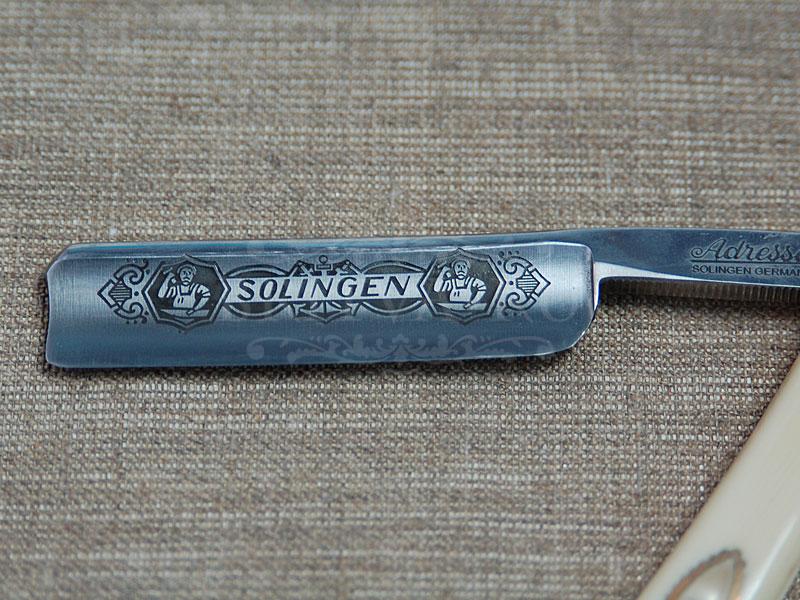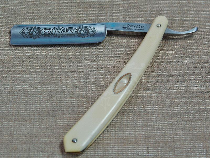 Ширина полотна 6/8", вогнутость 1/2, испанская головка, углеродистая сталь, ручка из пластмассы. Полотно украшено травлением в виде художественно оформленного сочетания гербов и названия города SOLINGEN. На лицевой стороне эрля вытравлен логотип фирмы в виде слов ADRESSO SOLINGEN GERMANY, на обратной стороне штамповка: FINEST SILVER STEEL MADE IN GERMANY. На ручке металлическая впайка с натуральным перламутром.