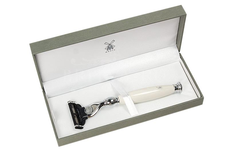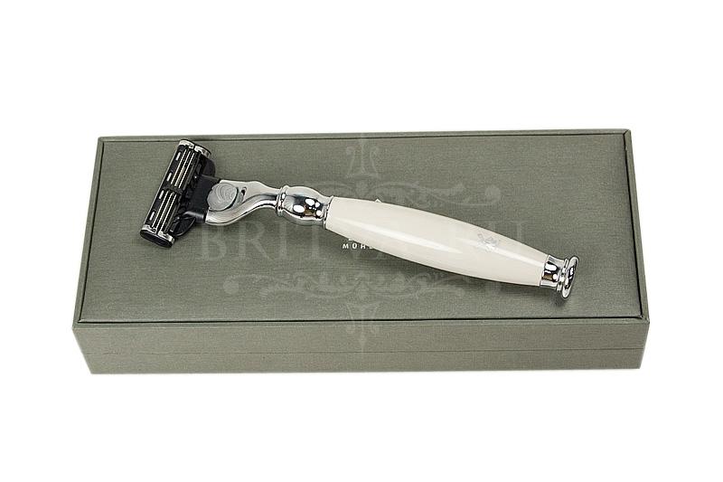 Станок адаптирован под бритвенную систему Gillette Mach3, ручка из фарфора/хромированного металла.