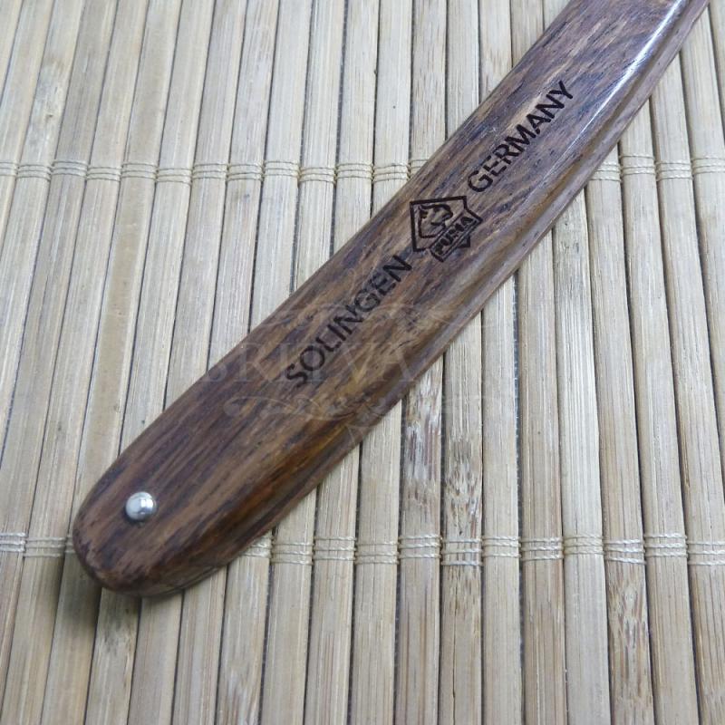 Полотно бритвы выполнено из знаменитой своими замечательными режущими качествами Дамасской стали. Ширина полотна приближается к 5/8", вогнутость 1/4 (почти клин). Травление на эрле: PUMA SOLINGEN. Головка бритвы имеет "французскую" скошенную форму. Материал ручки - дерево, с гравировкой в виде логотипа фирмы - ромб с головой пумы и надписью PUMA между слов SOLINGEN GERMANY.
