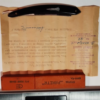 Артель "Бритва" Москва (*)Судя по сообщению уважаемого Антона(10.01.21.стр.10)это 1932-1933г.Получается-или тогда уже делали такие ручки,или ее кто-то очень аккуратно все-таки поменял.Ну,и заодно,клеймо в копилку Антона-модель Арт.Бритвы №75.(стр.7)