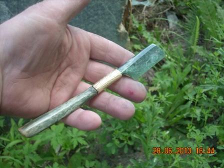Re: Каменная БритваЗдравствуйте господа! Попробовал я сделать бритву из камня. Строго не судите. Это просто проба. Для клинка взял нефрит. Твёрдость по шкале МООСа - 6,5. Стекло царапает. Теперь о клинке. Спуски вогнутые, Сведение меньше 0,5мм.. длина клинка - 96мм, ширина - 24мм, толщина обуха - 6мм. Не полировал. По...