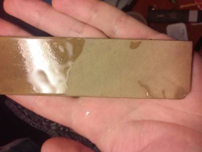 После заточки кромка получается матовая, цвет камня бежево-зеленый с вкраплениями темных точек. Суспензия получается желтовато-зеленого отттенка.