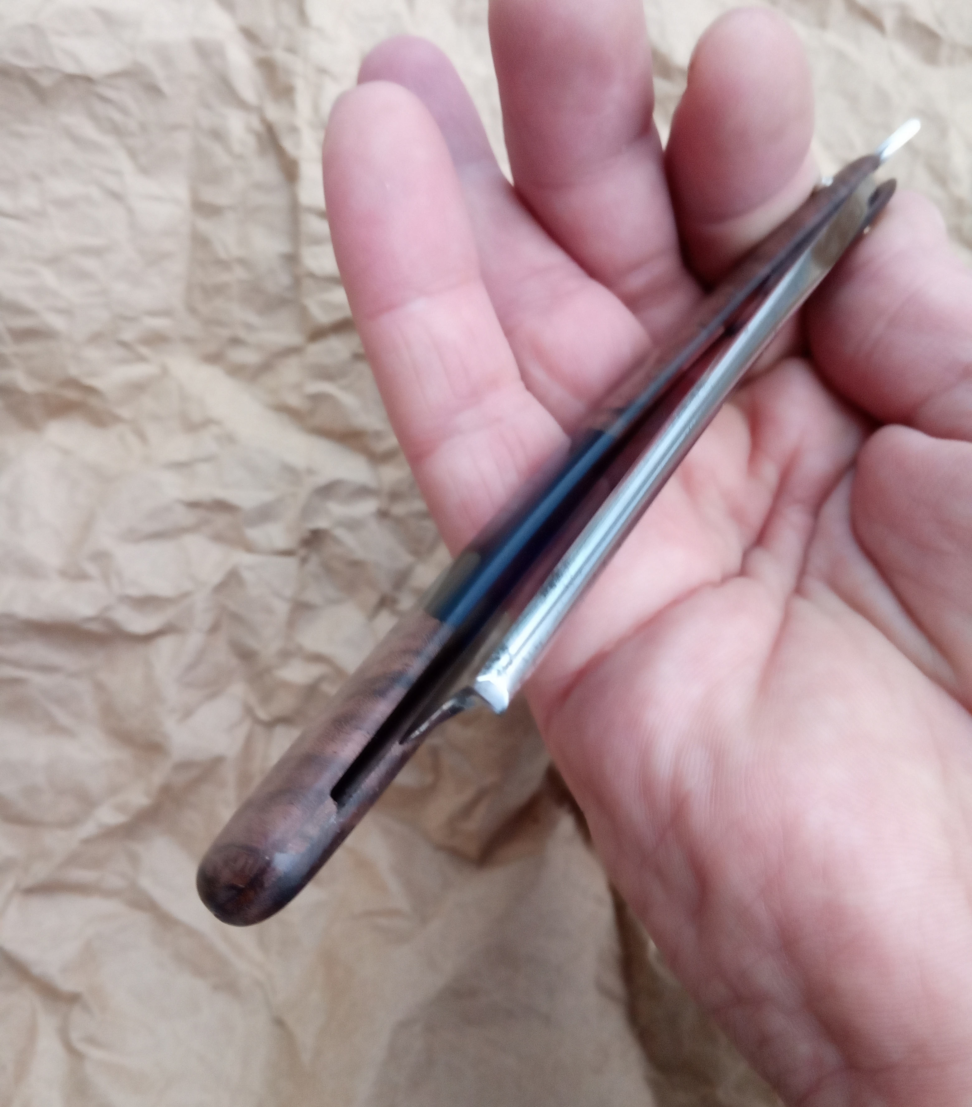 Почистил клинок. Оправу сделал из гибрида (сбилизировнный орех и смола) Zwilling J.A. Henckels AG, Solingen (*#)Купил за 300 р. то, что было на рис. 1, то, что сделал на рис. 2-5, ржу убрал преобразователем ржавчины, потом полировал не сильно войлоком вручную с гои. Волос разрезает поперек, в ноготь не впивается (скользит), задиров никаких не чувствуется, бреет вроде ниче так. Пины да, не очень, когда алюминиевую проволоку купил, бритва уже была с медными.