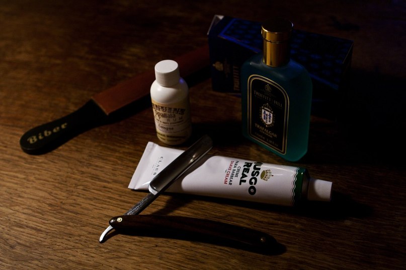 На фото мой набор для бритья: кожа с ГОИ, кожа для правки, кусок войлока для полировки, и собственно бритва. Ну про качество рукояти я уже писал...