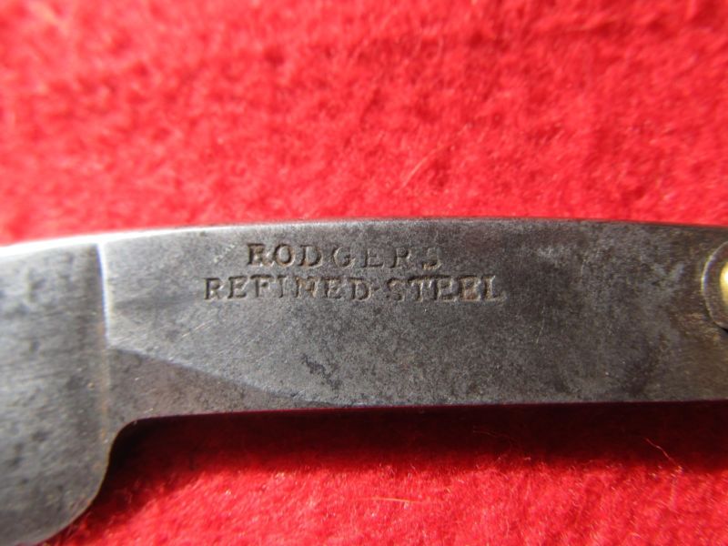 Шеффилдский клин ( небольшая вогнутость полотна присутствует, но она даже на квартер холлоу не тянет) "Rodgers refined steel". Какой из двух ветвей семьи Роджерс была выпущена эта бритва, остается загадкой, однако учитывая отсутствие слова sheffield на клейме, можно предположить, что сделана она была в первой половине XIXв. Оригинальной ручки не сохранилось. Учитывая размер (7\8), форму и массивность бритвы, новая ручка была сделана такого же типа как на батчеровских топорах "for barber's use". Материал - прессованный рог. Клинышек - олово. Шайбы - стальные батчеровские. Bart und Mantel machen den Philosophen nicht.