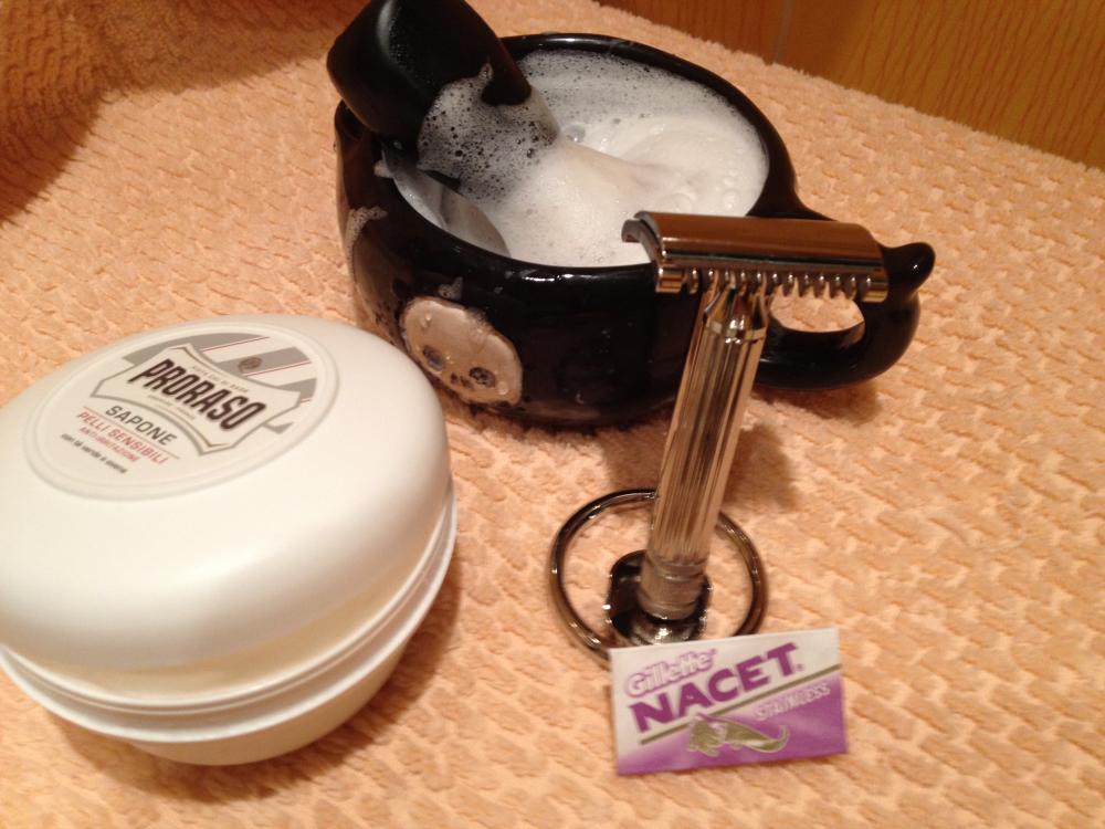 Бритва - J.A.HENCELS SOLINGEN № 81, одна из самых первых и самых любимых; Мыло - Proraso сандал-ши; Помазок - Muhle барсук; Чаша типа аптекарской ступки; Одеколон - Тройной от Наполеона, Новая Заря.