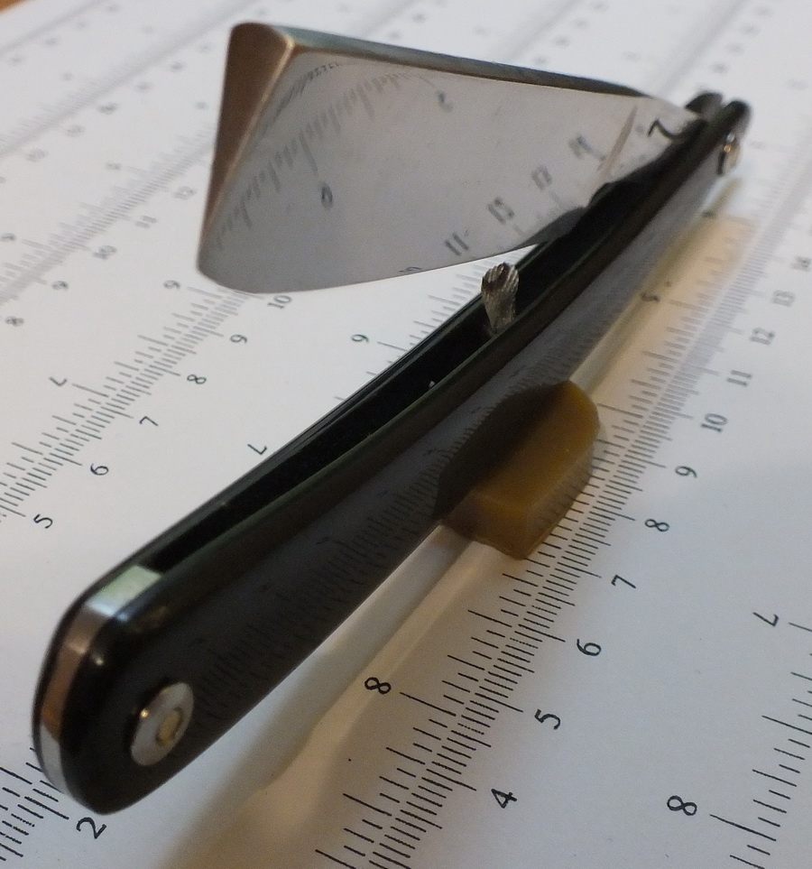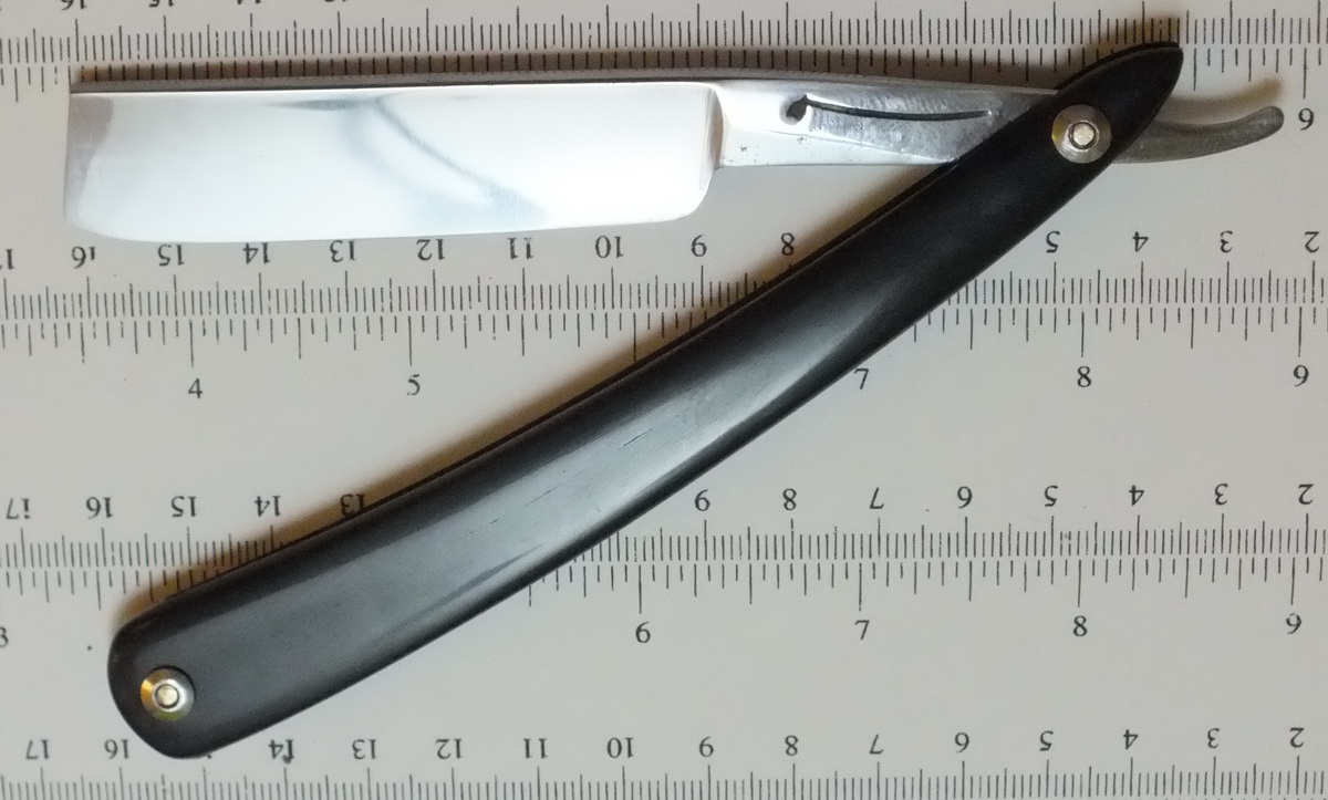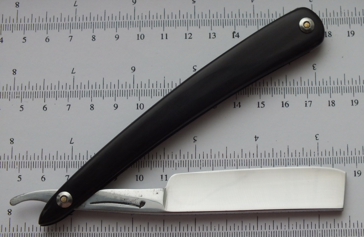 Клинок уставший. Но вполне ремонтопригоден. Оправу сделал заранее, пока бритва ехала с Украины. Рог от Boris, полосатый (черно-коричневый). Вытяжные заклепки из нержавейки М2. Клинышек ПОС-61. Вся работа занята шесть часов. Вот что вышло: 32 года активно мусолю харю клинковой бритвой