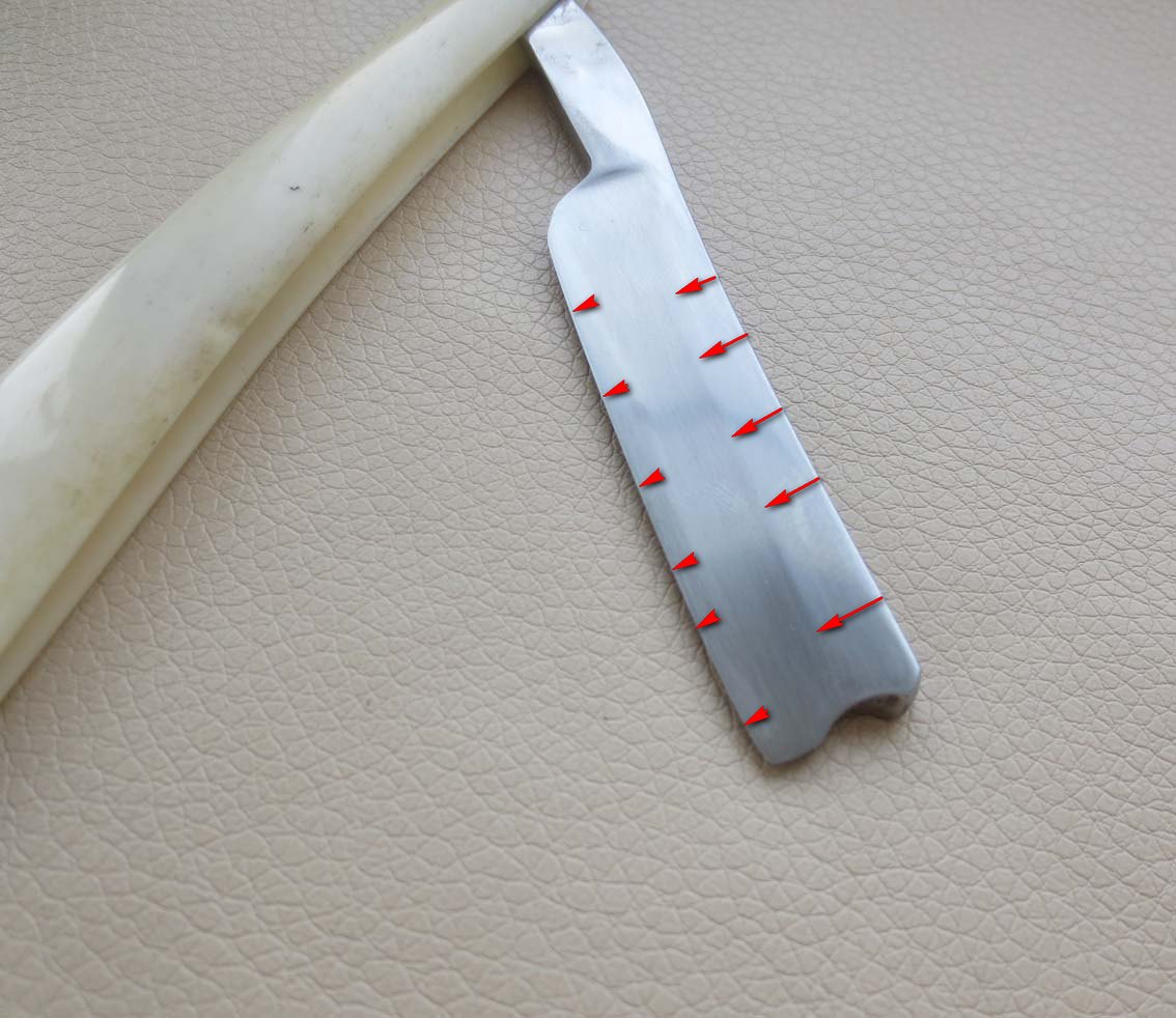 клина. На фото полотна видно ровные участки (отметил стрелками). С такими экземплярами повозиться, конечно приходится, но результат того стоит, можно спокойно точить с одним слоем скотча или изоленты, а можно и без оного, кому как нравится... Бесит, когда приходится пользоваться бритвой моложе себя...