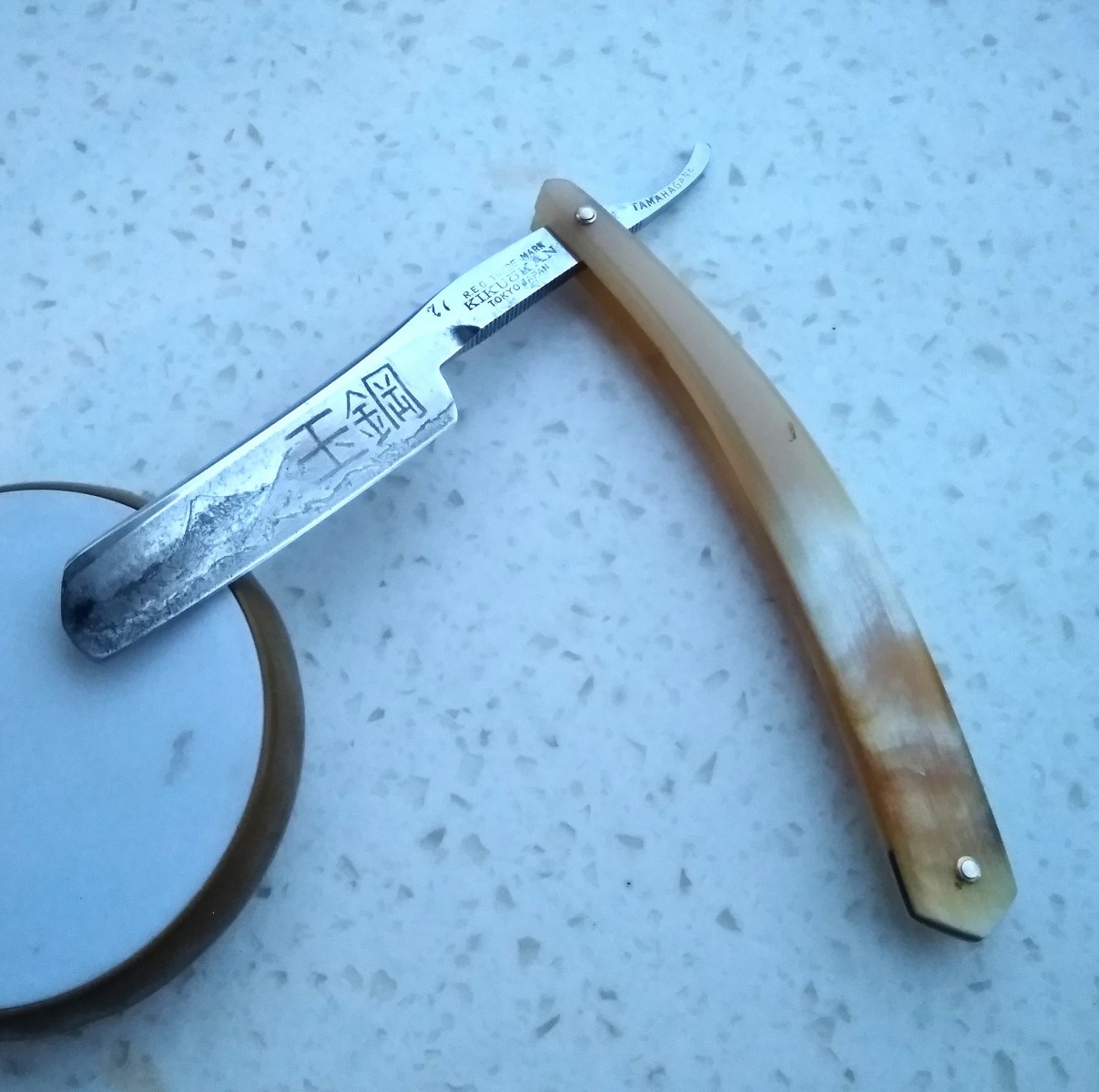 Re: Бритва до... и после...Восстанавливал японца. Ручка развалилась при разборе. Решил сделать из коровки. Клинышек из буйвола. На клинке решил вытравить хамон, иероглиф тамахагане и фудзияму)