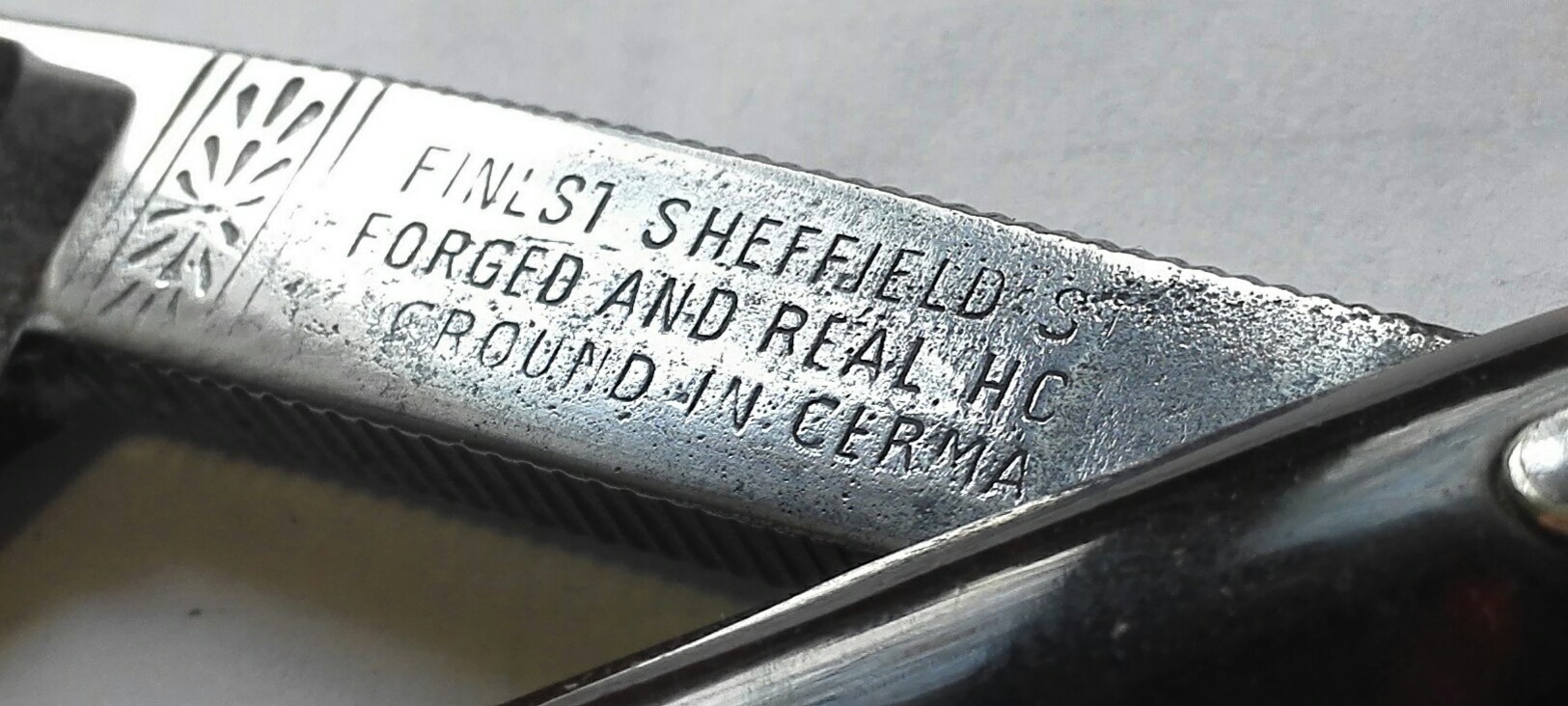 "finest sheffield steel forged and real hollow ground in germany" писали на многих бритвах, достаточно эту фразу вставить в гугл и посмотреть на картинки. маленькая зацепка это шрифт, размер шрифта и узор слева, но тоже нет уверенности, что это отличительная черта какого-то производителя.
