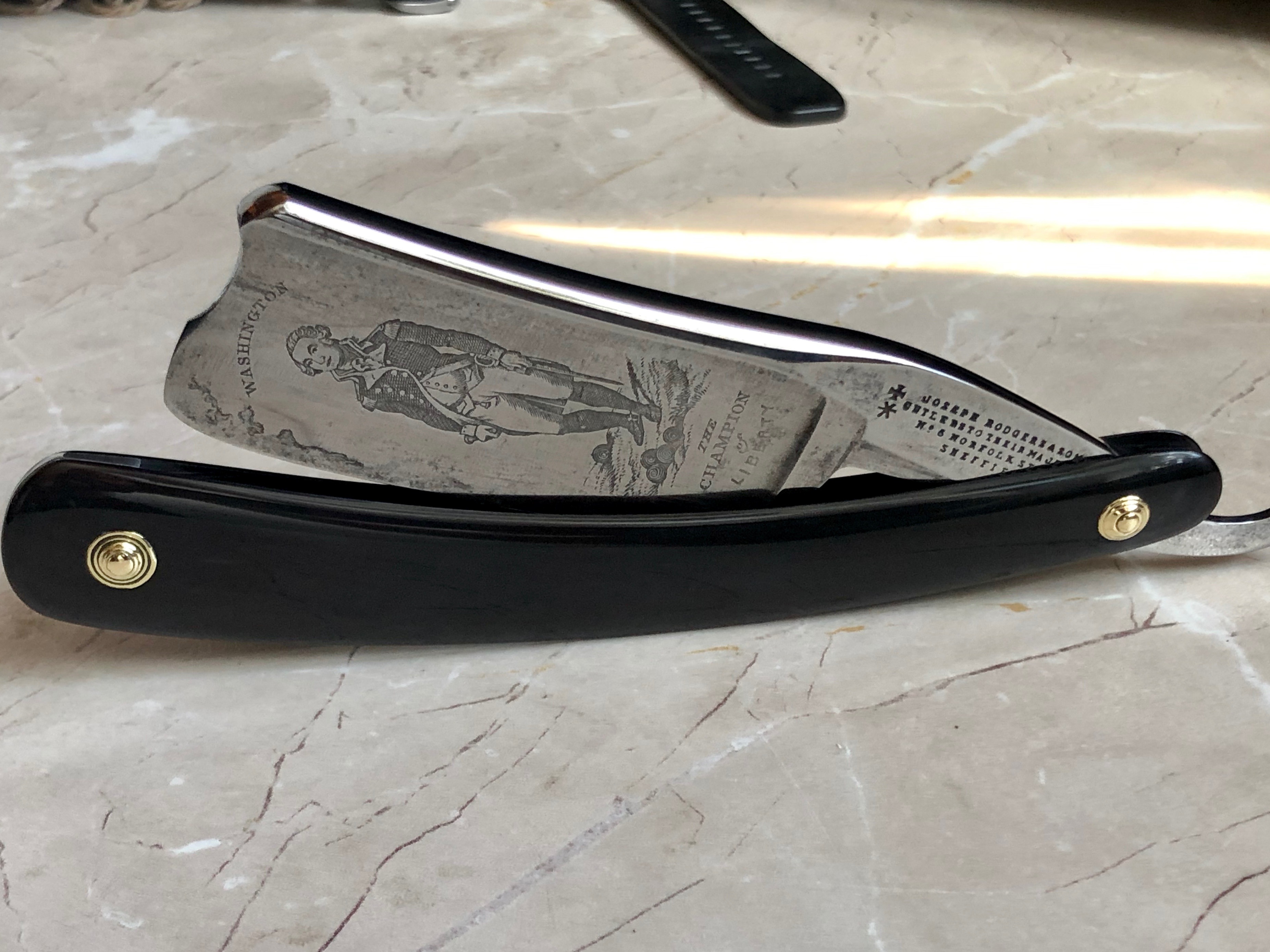 Бритва до... и после...Добрый вечер, Уважаемые форумчане!! Принесли мне на реставрацию бритву , что хотелось бы сказать, хочу обратить Ваше внимание на нюансы, точность травление рисунка, эстетику клинка. Это конечно мое субъективное мнение но есть чему поучится нашим мастерам которые делают бритвы, ручки. Да в процессе реставрации, мной была заменена ручка, клин и шайбы, ручка точная копия оригинала. Просто очень интересно Ваше мнение. Да чуть не забыл размеры: Ширина клинка