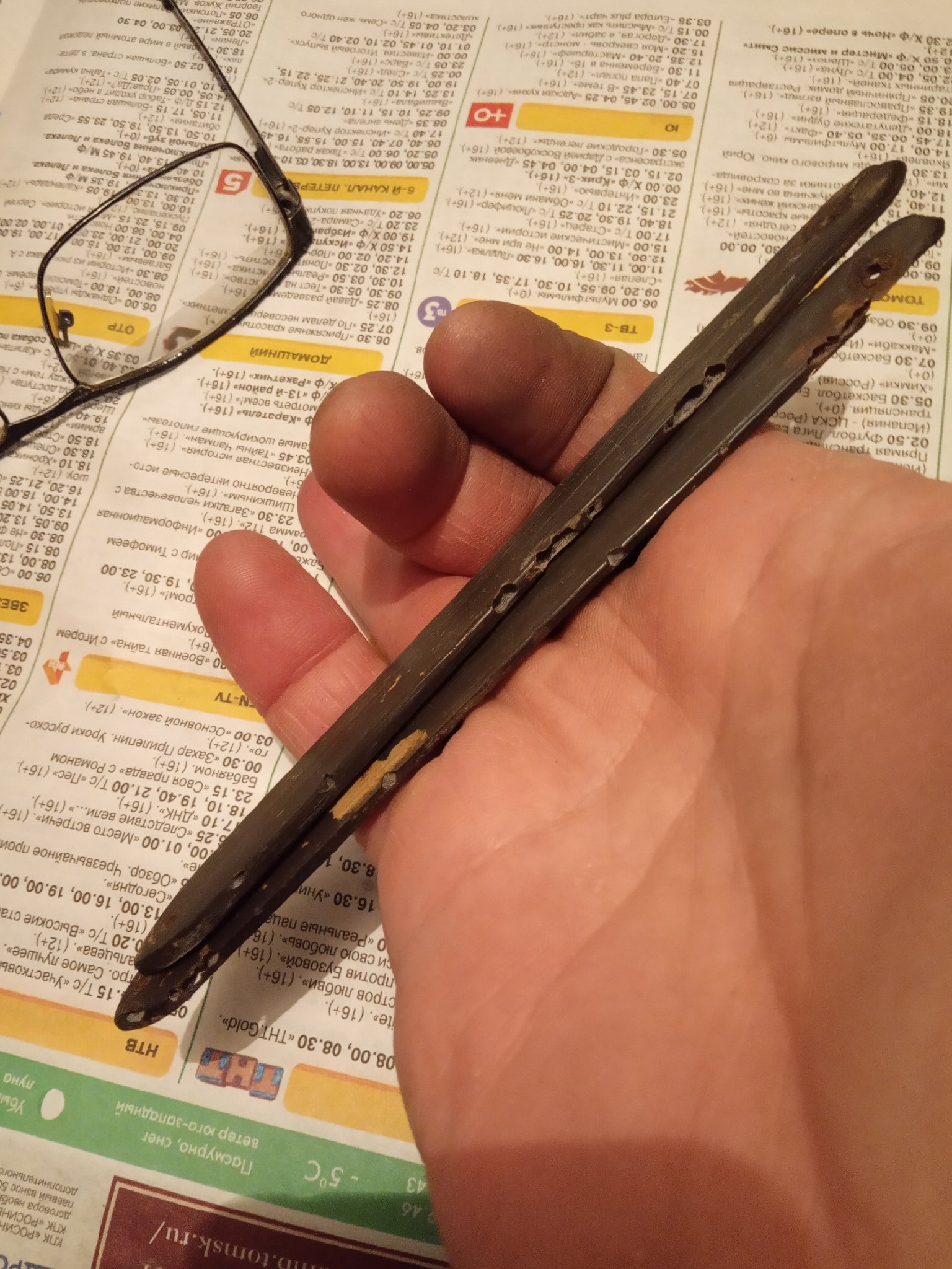 Бритва до... и после...Уже обсуждали года четыре назад. Некоторые роговые оправы имеют округлые сколы и выщербины. Пару раз такое наблюдал прямо у меня в руках. Щёлк и кусок отвалился.