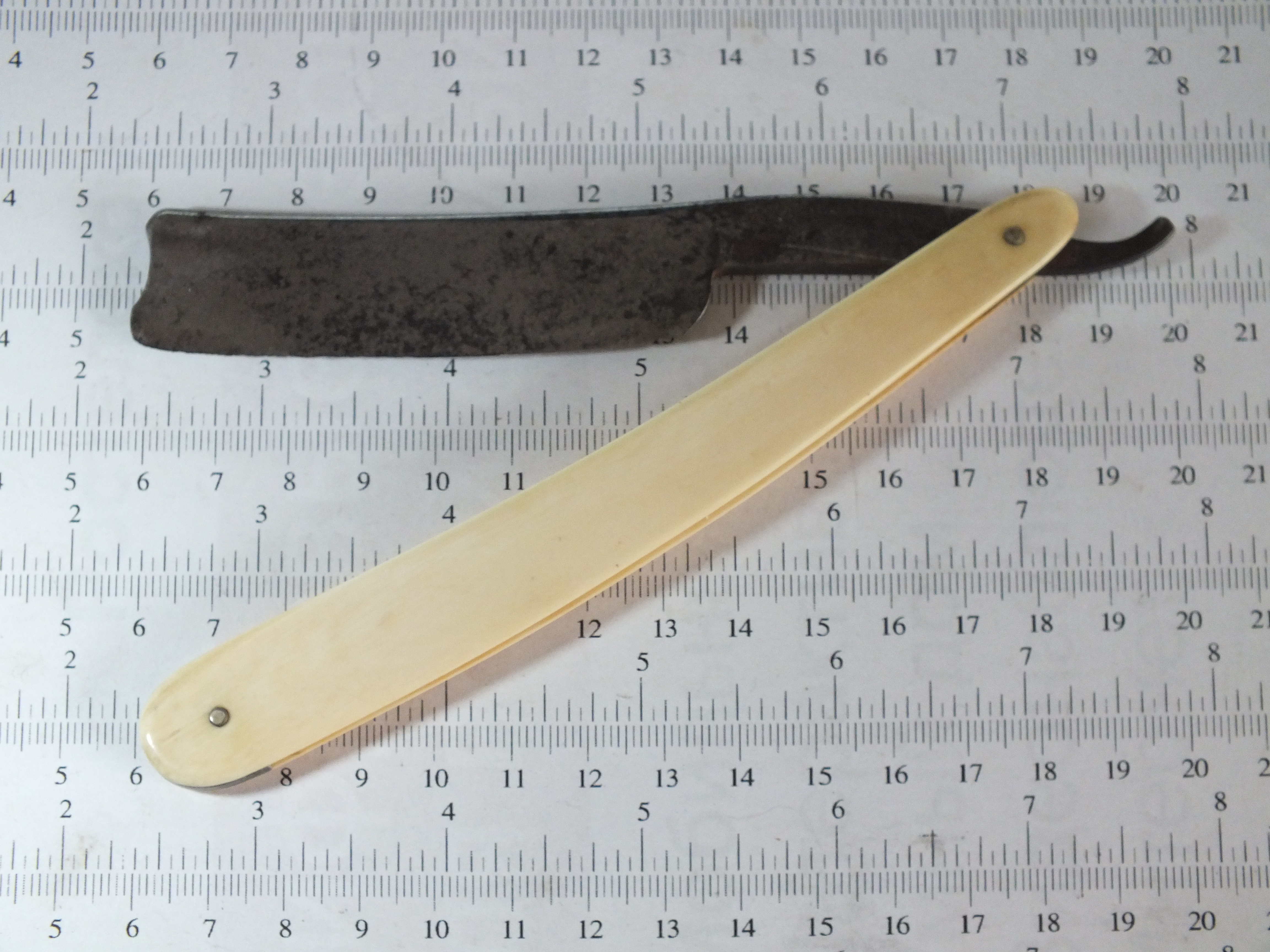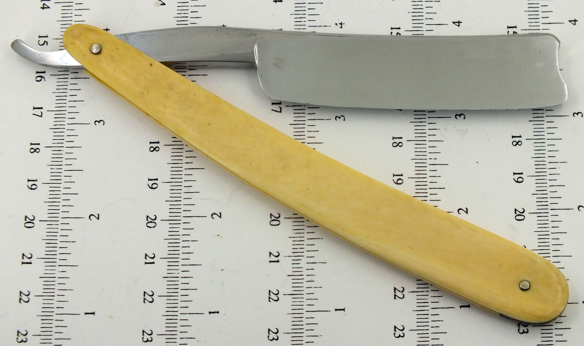 В такой ситуации нельзя поставить заклепку, просто ручка потрескается, потому что под ней нет твердой опоры. Чтобы получить ровную поверхность, пришлось бы стереть всех надписей, но я этого не хотел, поэтому шлифовал металл толко на узких участках ерла – шириной чуть больше 10 мм. На этих участках поставлю внутренних шайб из нержавеющей стали толщиной в 0,45 мм. Так как после очистки от ржавчиный диаметр осевого отверстия увеличился на 2,6 мм, впритык просверлил новое отверстие диаметром 1,8 мм для осевой заклепки. В старом отверстии поставил кусочек ненужного винтика и приклеил епоксидкой. Вот как выглядит ерл после такой обработки: Узкие участки ерла шлифуются при помощи куска стали (размер 10х10х100мм), на котором приклеивается наждачная бумага. И начал шлифовать, ех раз, да еще раз, да еще много-много раз ... В общем, участки „утонули” на около 0,20 мм ниже поверхности ерла. После заклепывания, зазор между ерлом и ручки сохранился. На фото это хорошо видно: В дальнейшем поставил ручку от „погибшей” немки и Волга обрела вторую счастливую жизнь. Я таких вещей (шлифование узких участках ерла) проделывал несколько раз и всегда с отличным результатом. Вот бритва после вышеописанной операции: С 2013 г. с кайфом бреюсь опасной бритвой пять раз в неделю, в три прохода.
