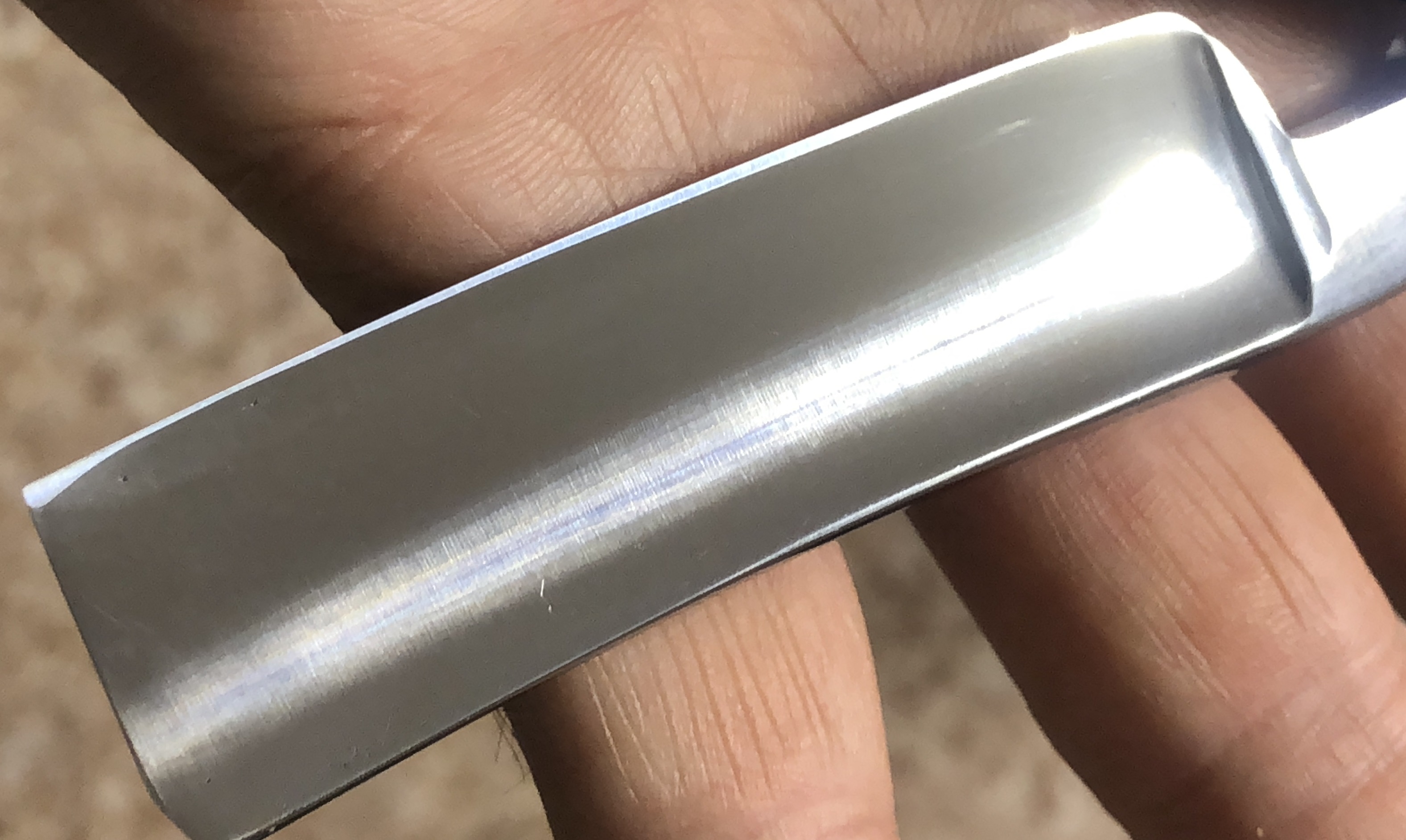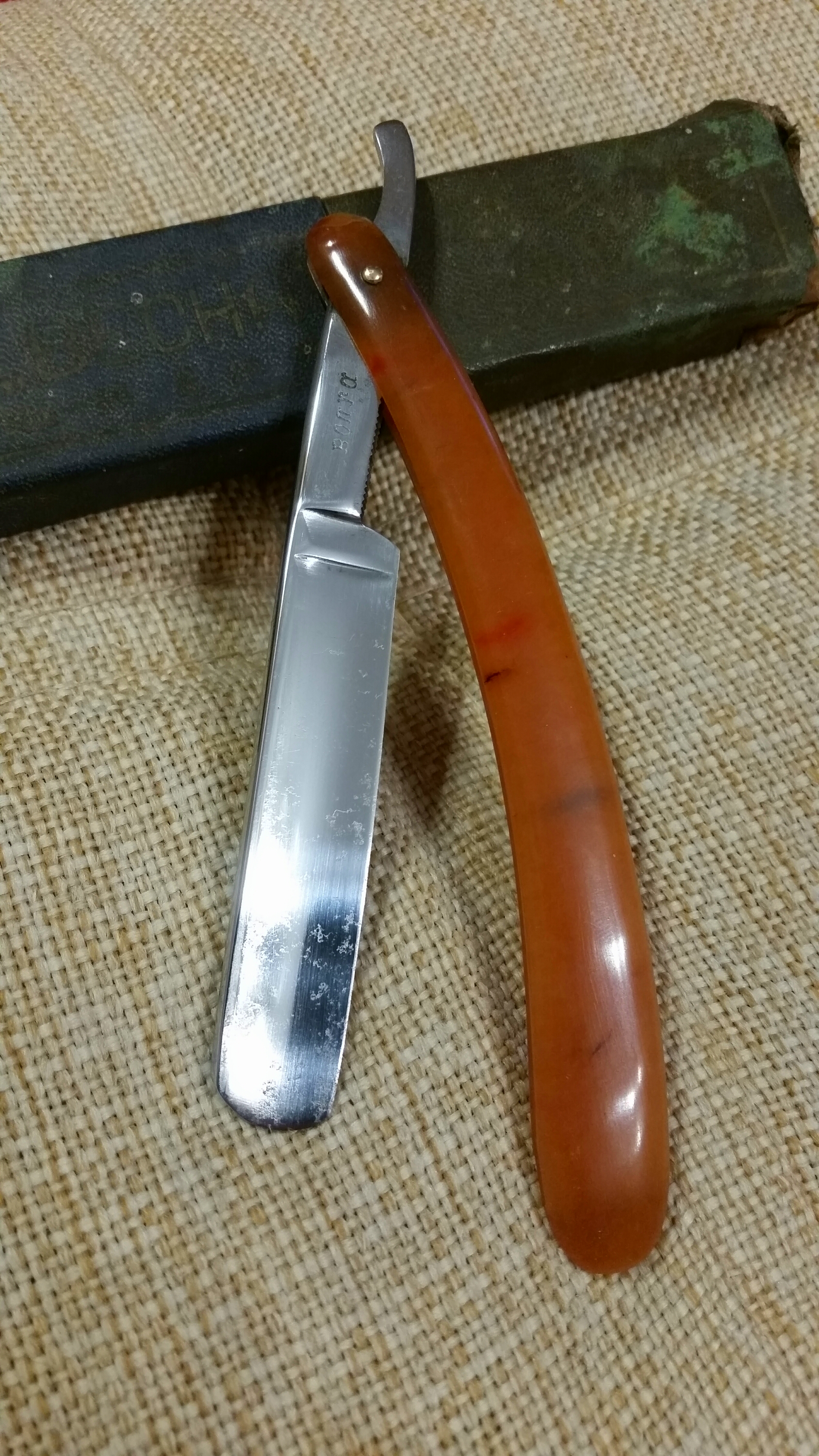 WADE&BUTCHER размером в 7/8 и полной вогнутостью. Никогда у меня не было такой крупной бритвы , с такой вогнутостью.Изящная,с аккуратным и тонком сведением, но в тоже время мощная и серьезная. Полотно на первом этапе было подготовлено методом ручной шлифовки на грубых камнях,с переходом на более тонкие абразивы,до 800 поперечной риски.Никакой патины на эрле в этот раз. Ещё раз отдельное спасибо нашему комраду Алексею Белякову за приведение оригинальной роговой ручки в идеальное состояние.Одна родная плашка была зашпаклевана и отполирована, а вторая, которая пришла разгрызанной ,была заменена на идентичную, того периода,с рифленой структурой материала.В итоге получилась совершенно оригинальная оправа, с одинаковыми плашками, как по структуре, так и по размеру.Родные пины были сохранены и заново установлены. До...