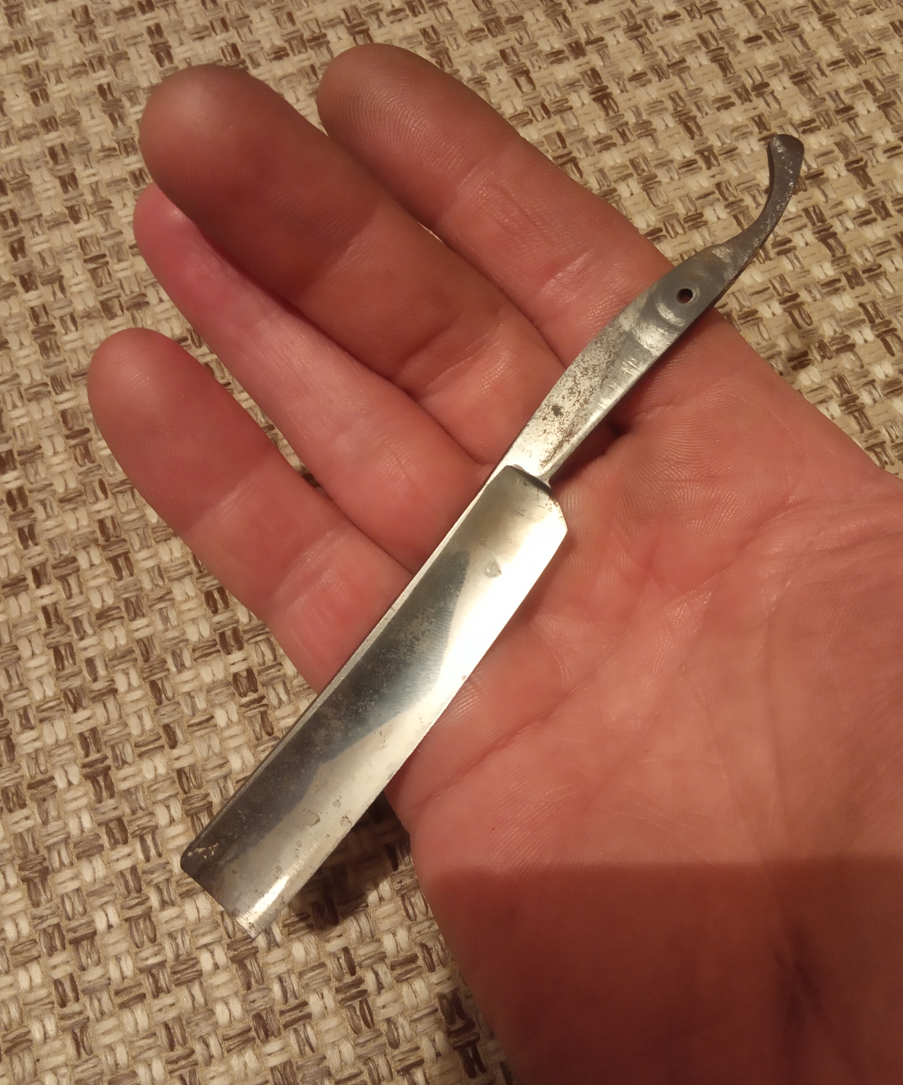 Как оказалось, геометрия отличная - заточил довольно быстро. И пошел бриться. Бритва хорошо бреет, но звук был очень странный, потому что, кроме сильного шуршания, отчетливо слышен неприятный резонанс. При помощи наждачной бумаги P1500 снял оксидацию и все поражения ржавчиной стали видны. В дальнейшем пришлось их шлифовать вручную. Но выяснилось, чем вызван резонанс во время бритья - трещина: Направление трещины указывает, что нужно сделать. Я зашлифовал нос и превратил его в прямым. На следующий день побрился и резонанса уже не было. Только сильное шуршание, потому что выборка бритвы очень крутая: Замерил, 0,09 мм. Вот какие мастера были! С 2013 г. с кайфом бреюсь опасной бритвой пять раз в неделю, в три прохода.