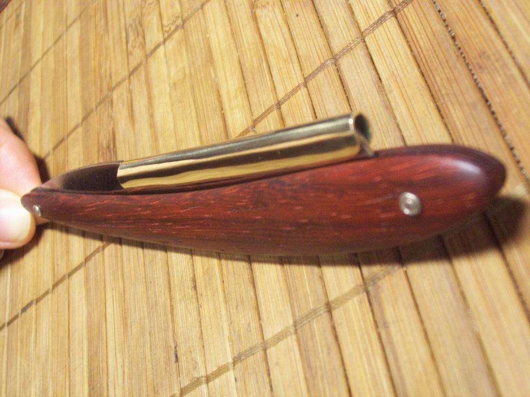 Re: Наши работы (галерея достижений)Еще одна попытка "повинтажить" с деревом. С бритвой шла костяная ручка, явно не "родная", т.к. большая по размеру, чем клинок и абсолютно с ним не стыкующаяся. Слепил новую из бразильского тика и латуни, пытался сделать в скандинавском стиле, бритва - швед все-таки.