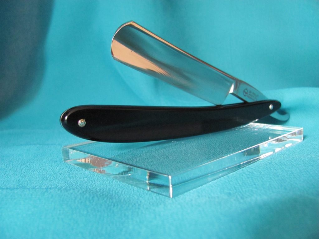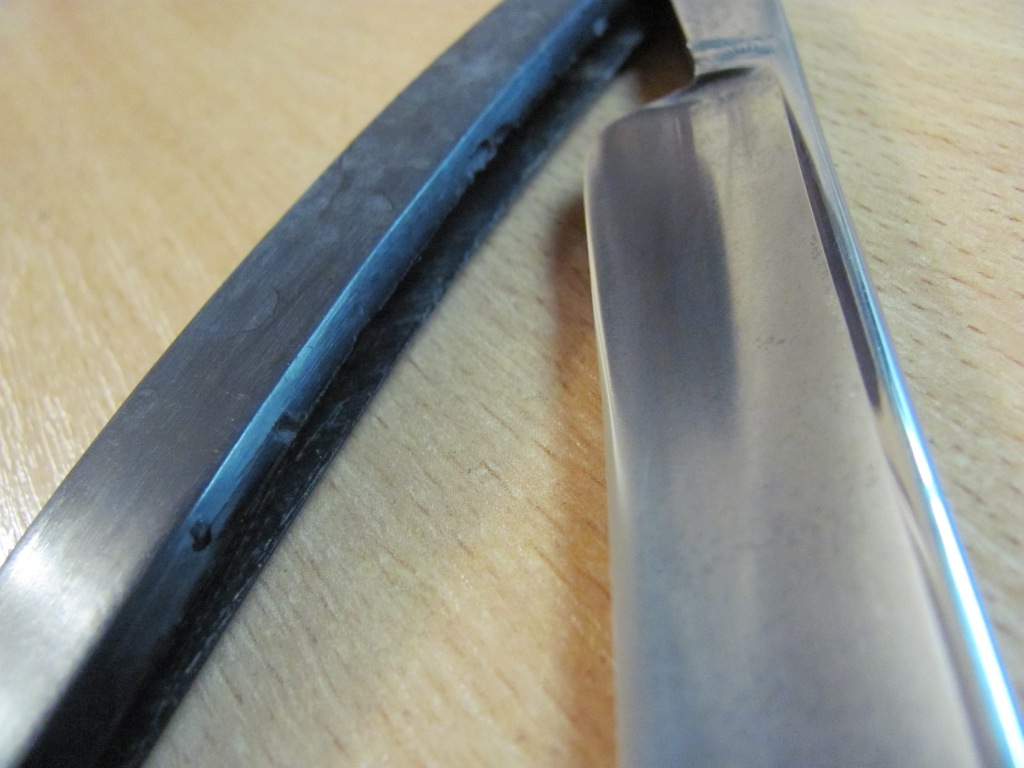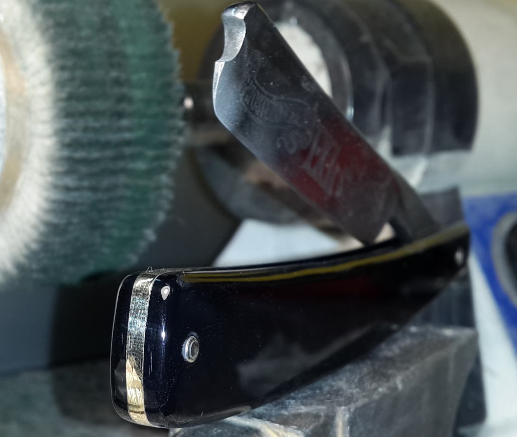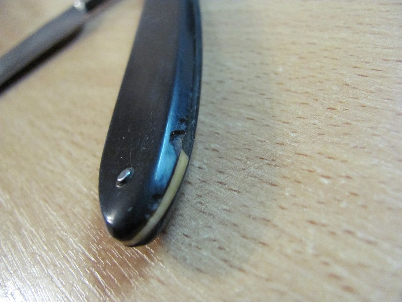 Старая ручка была покусана грызунами, полотно было грустно улыбчивым. Было принято решение одеть достойную бритву в копию оригинальной ручки и привести в порядок полотно. Кстати, сталь у Grelot действительно прекрасна. Получил огромное удовольствие при выполнение этого заказа. покусанная ручка Show