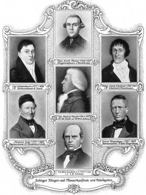 Linke Reihe: Carl Schimmelbusch, 1777-1839 Abraham Grah, 1777-1862 Mitte: Peter Arnold Mumm, 1733-1797 (Klingen- und Weinhandel) Joh. Abraham Knecht, 1741-1797 Joh. Abr. Henckels d.J., 1813-1870 Rechte Reihe: Philipp Jakob Schnitzer, 1759-1811 Gustav Weyersberg, 1798-1865 Когда Бог призовет меня на небесное построение, я буду гладко выбрит.