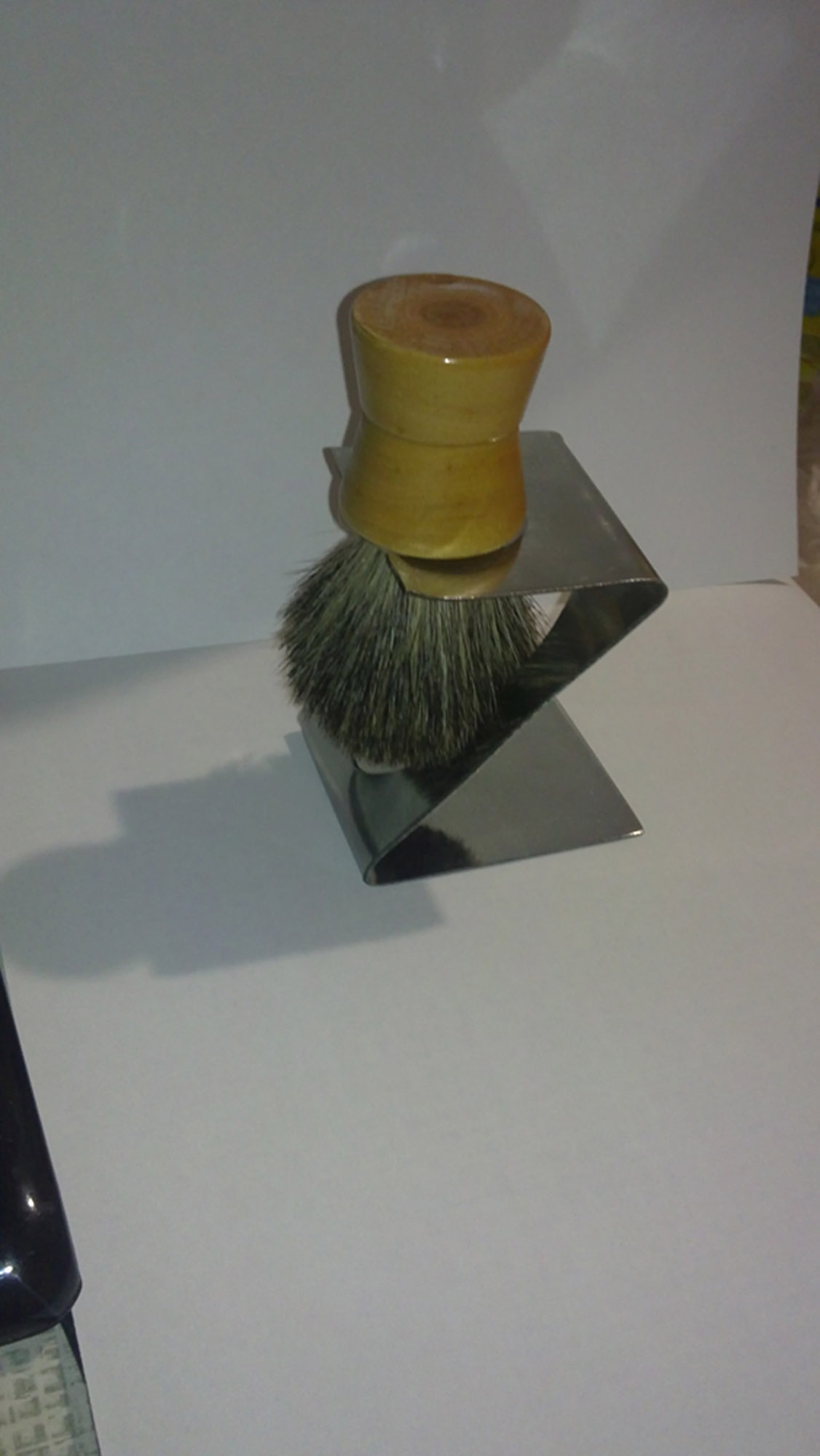 Сделал две подставки с нержавейки. Та что первая оставил для своего маленького помазка, вторую другу подарил - у него помазок покрупнее, да и смотрится посолидней. Толщина метала 0,5 мм, вырезал знакомый на "плазме" , по моим чертежам. Я снял заусенецу (она там крупной получилось), отполировал и согнул.