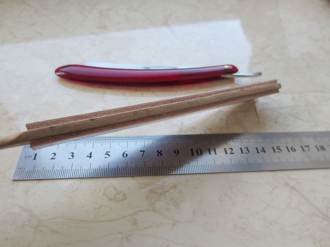 В преддверии отпуска сделал себе, чтобы не тащить с собой большой ремень, миниатюрную двухстороннюю досточку для правки, размером с бритву. Буковая планка 4 мм и два кусочка кожи 15 х 2,5 см, руки и 15 мин свободного времени. Одну сторону можно запастировать, если уезжаете надолго. Весит сие изделие - 28 грамм, бросил с бритвой в зип пакет и всё для правильного бритья у вас уже имеется, а кусок мыла всегда можно найти на пляже... Бесит, когда приходится пользоваться бритвой моложе себя...