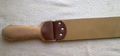 Re: Изготовление ремней для правкиВот отреставрировал старенький ремешок (кстати может кто подскажет что это? клейм нету...). Пришлось отдирать ручку капитально, да и кожу менять на новую.