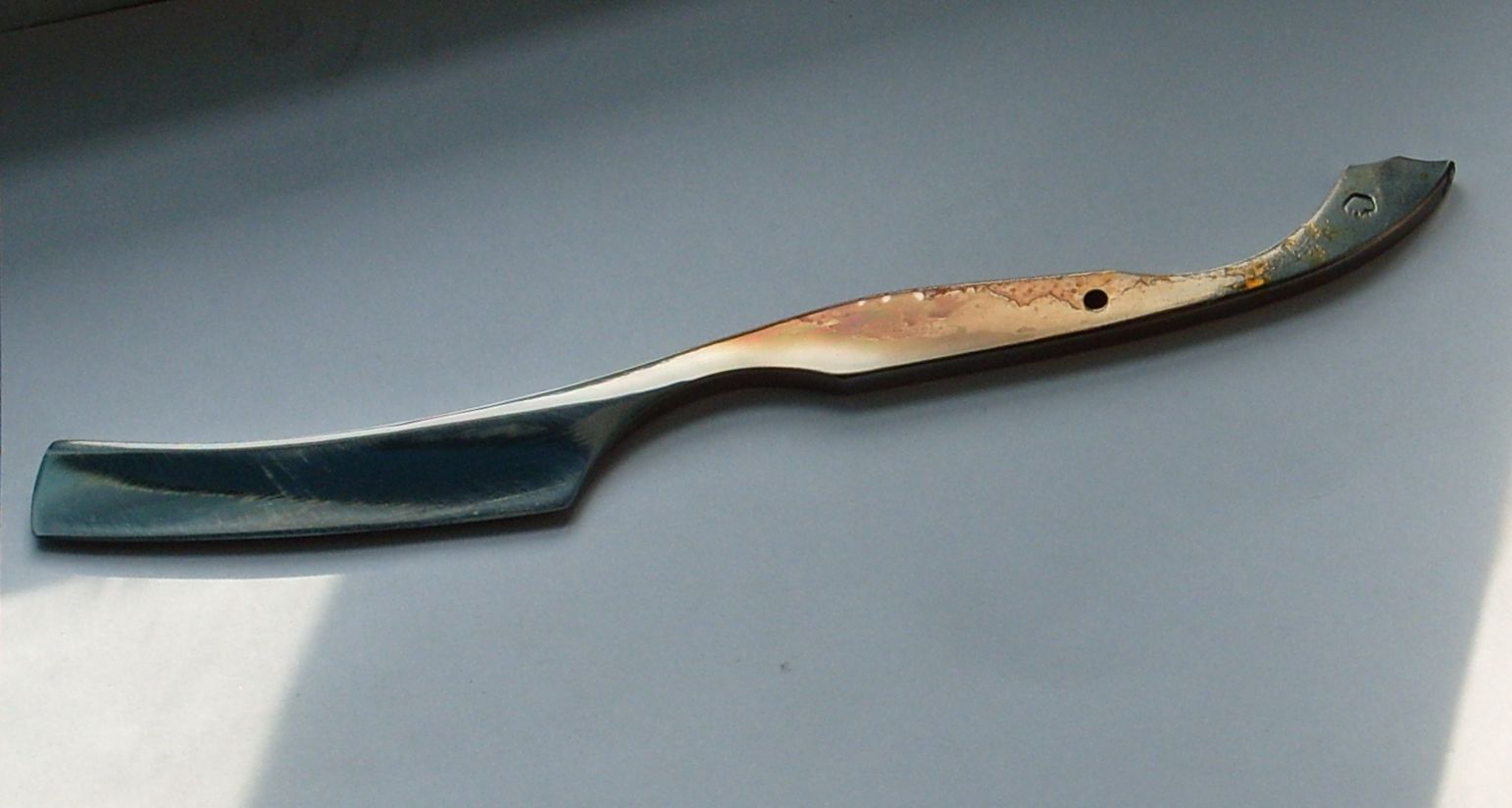 Ну а так, это не выпендреж, и даже не задумка, а последствия ковки..)) Я ж первый раз делал... как после ковки загнулась, так и есть... Сам убедился в том что прямая все же практичней... в заточке именно.. а в бритье... думаю такой формы бритва удобнее....
